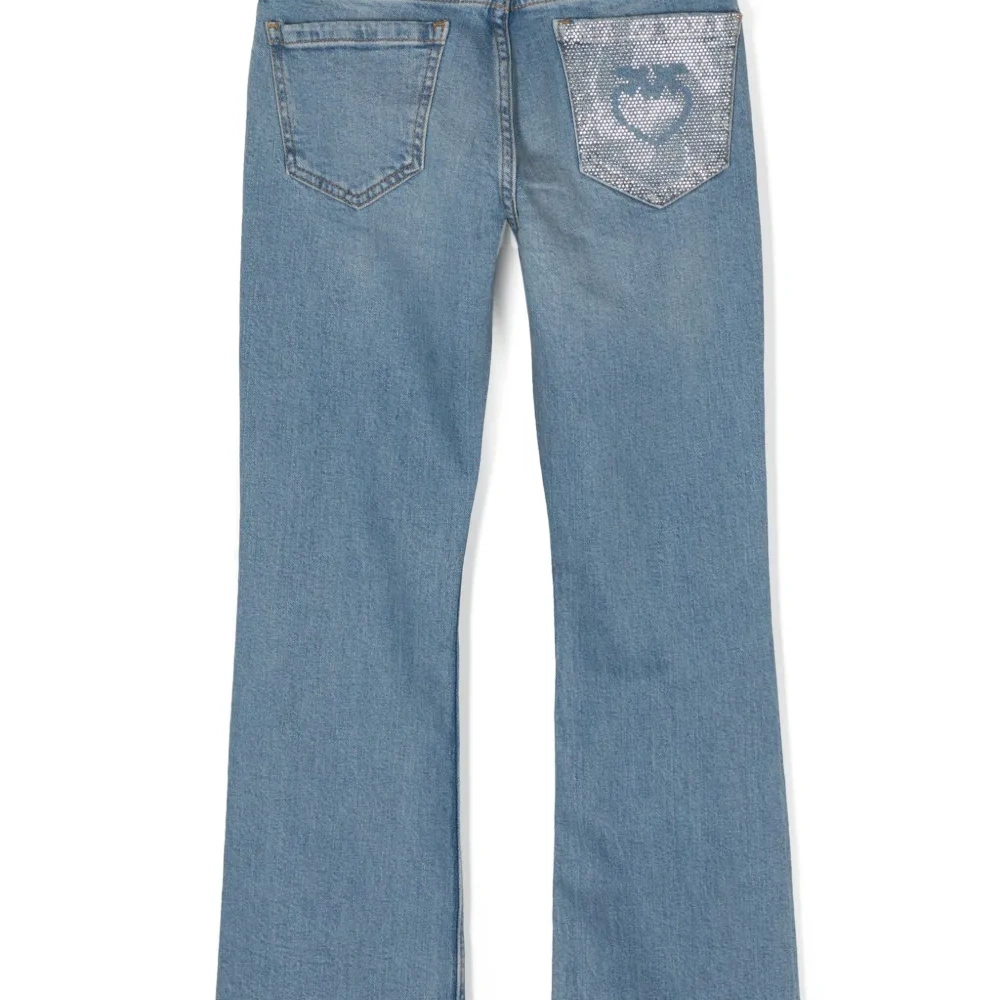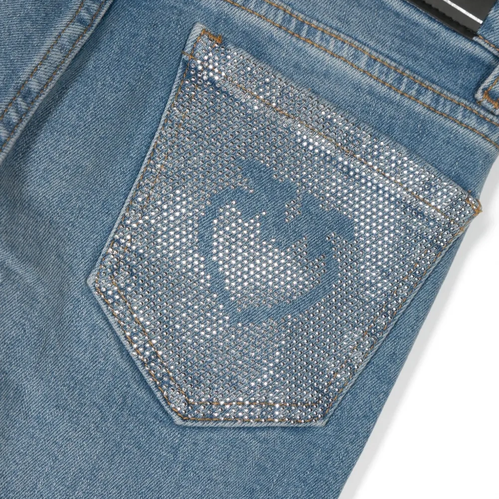 Голубой, эластичный хлопок, обработанный деним, украшения из горного хрусталя, прямой крой и пять карманов.