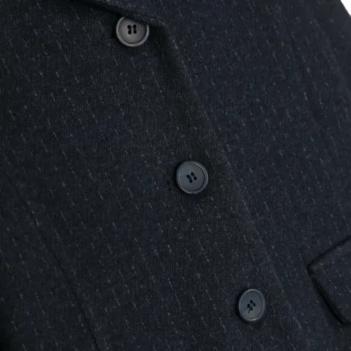 Темно-синий, узор в вертикальную полоску, зазубренные лацканы, застежка на пуговицах спереди, длинные рукава, манжеты на пуговицах, два нагрудных кармана с клапанами и прямой подол.