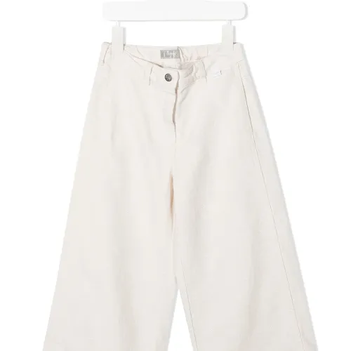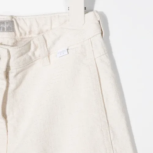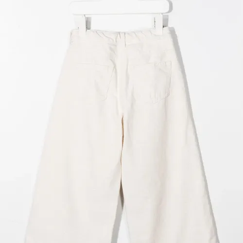 Средняя посадка, петли для ремня, застежка на молнии и пуговице спереди, два накладных кармана сзади и прямой крой.