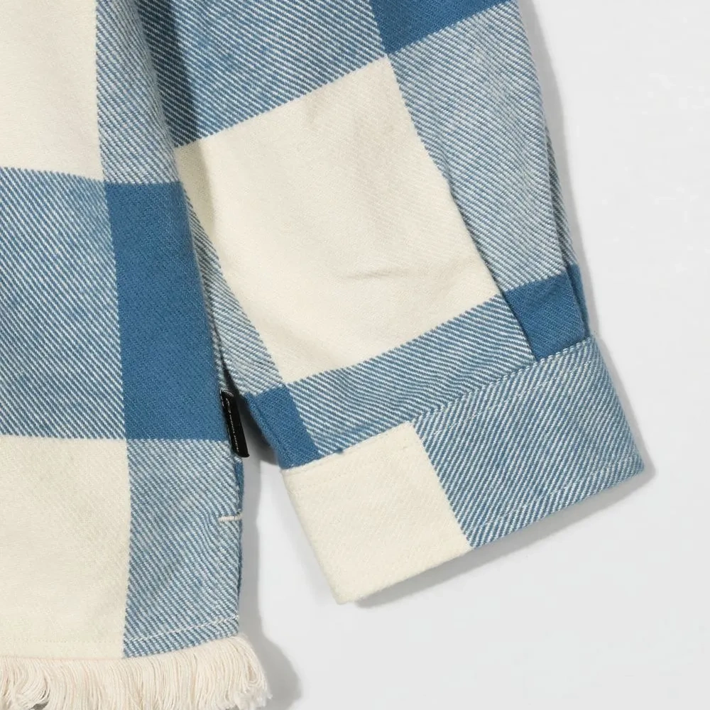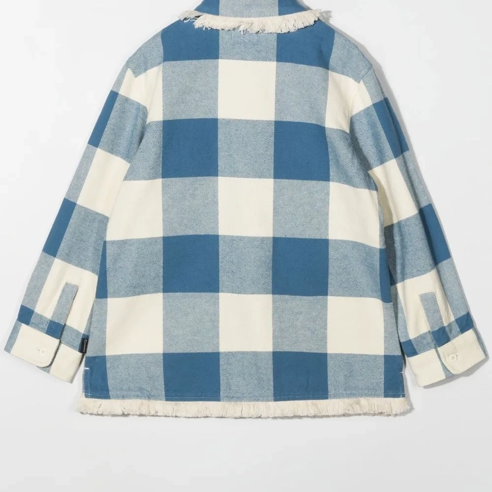 Белый, синий, хлопок, застежка на пуговицах спереди, воротник с оборками, длинные рукава и подол с оборками.