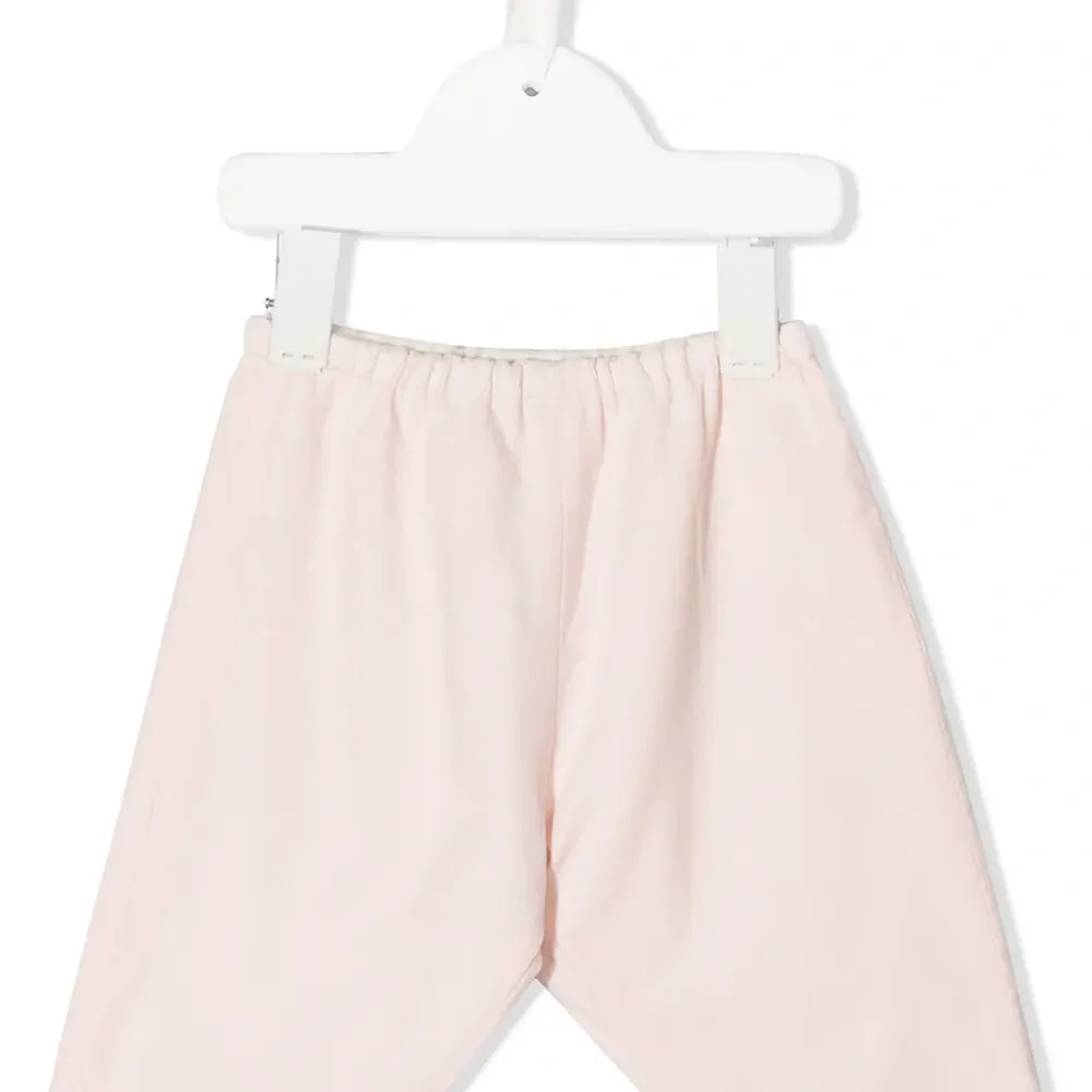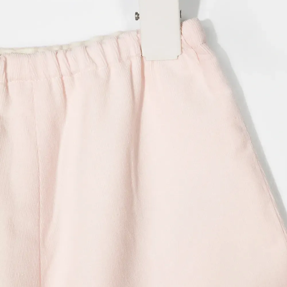 Детали в рубчик, эластичный пояс, без застежки, прямой крой и накладной карман сзади.