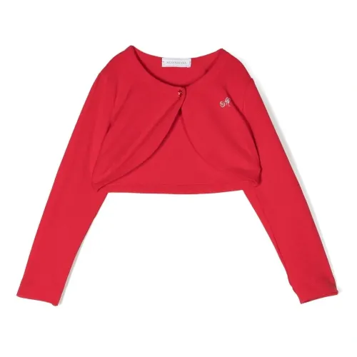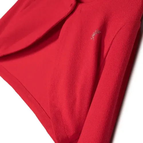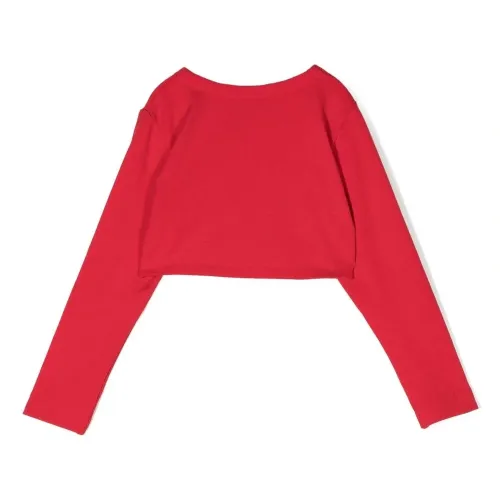 Красный, тисненый логотип спереди, круглый вырез, укороченная длина, застежка на пуговицы и длинные рукава.