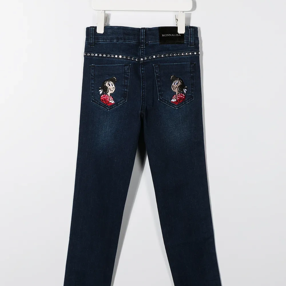 Полоска сбоку, средняя посадка, петли для ремня, застежка на молнии и пуговице спереди и классическая пятикарманная модель.
