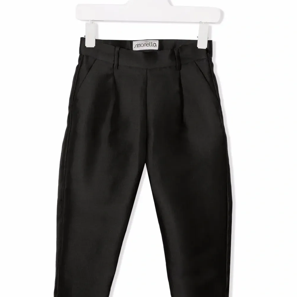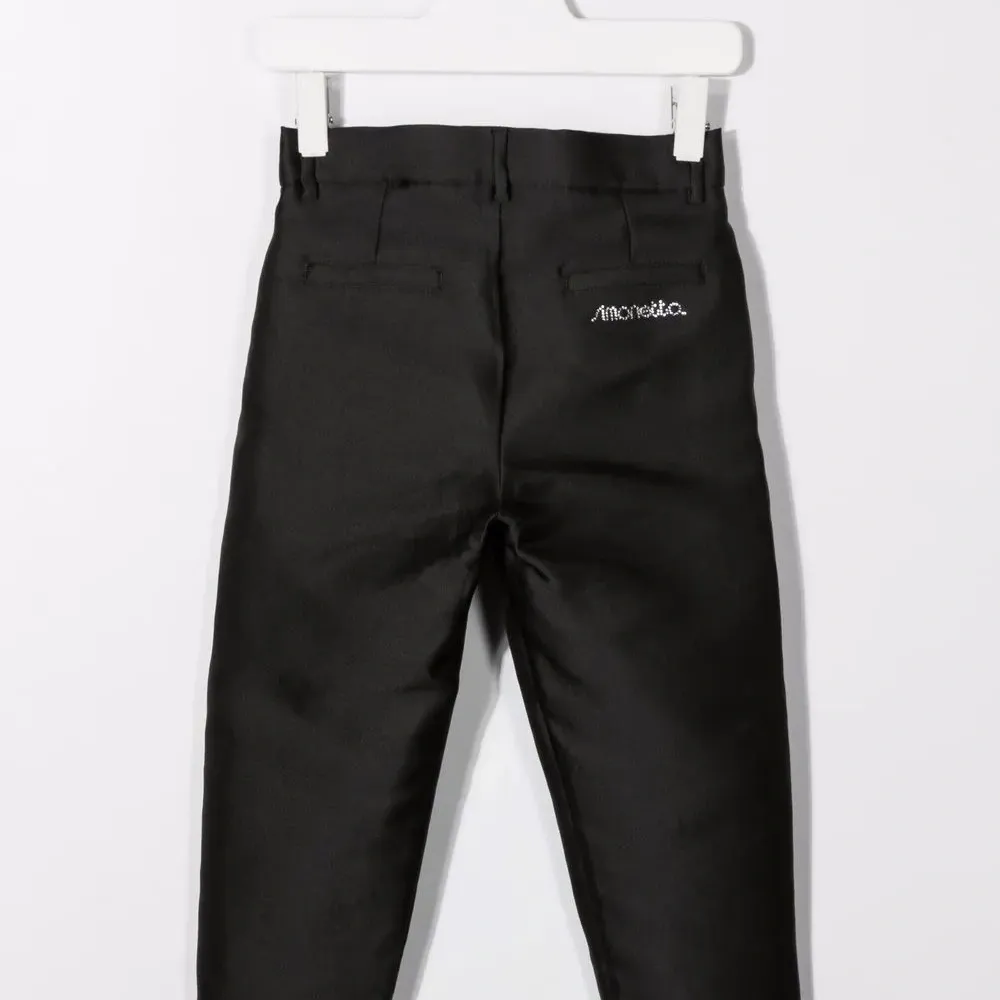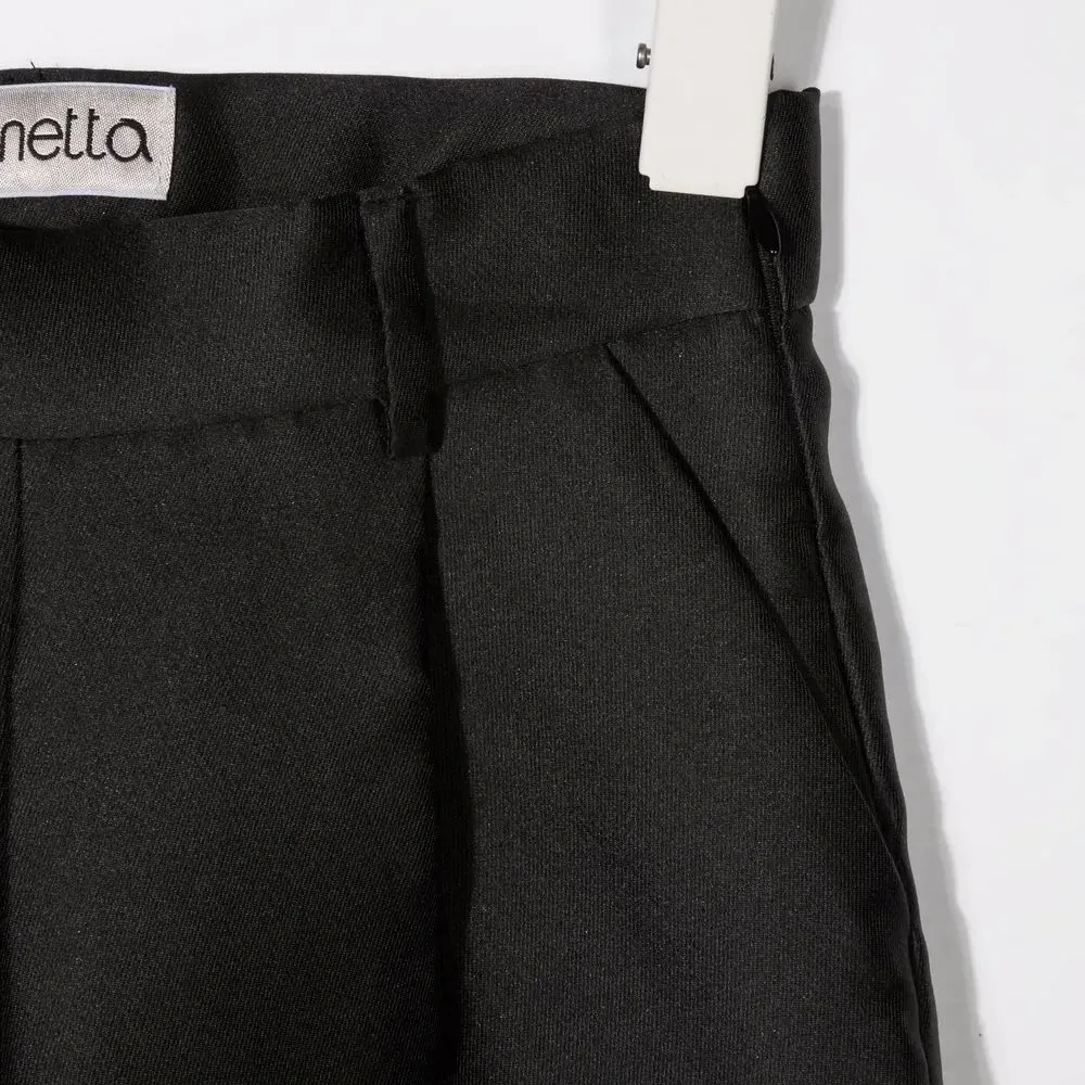 Средняя посадка, петли для ремня, застежка на молнии и пуговице спереди, два прорезных кармана по бокам и задние карманы с листочкой. Цвет: черный.