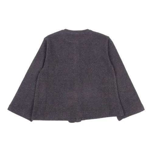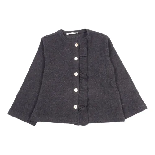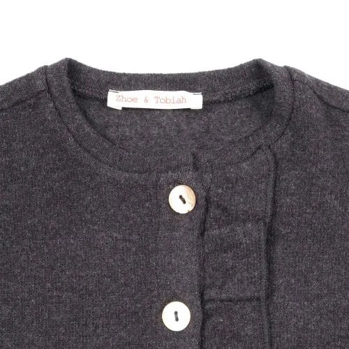 антрацитово-серый круглый вырез застежка на пуговицы спереди отделка рюшами длинные рукава расклешенный подол