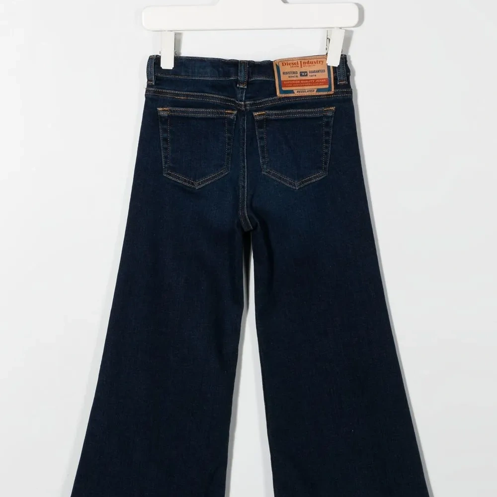 Синий, смесовый хлопок, крой bootcut, средняя посадка, нашивка с логотипом спереди, нашивка с логотипом сзади, застежка на молнии и пуговице спереди и пять карманов.