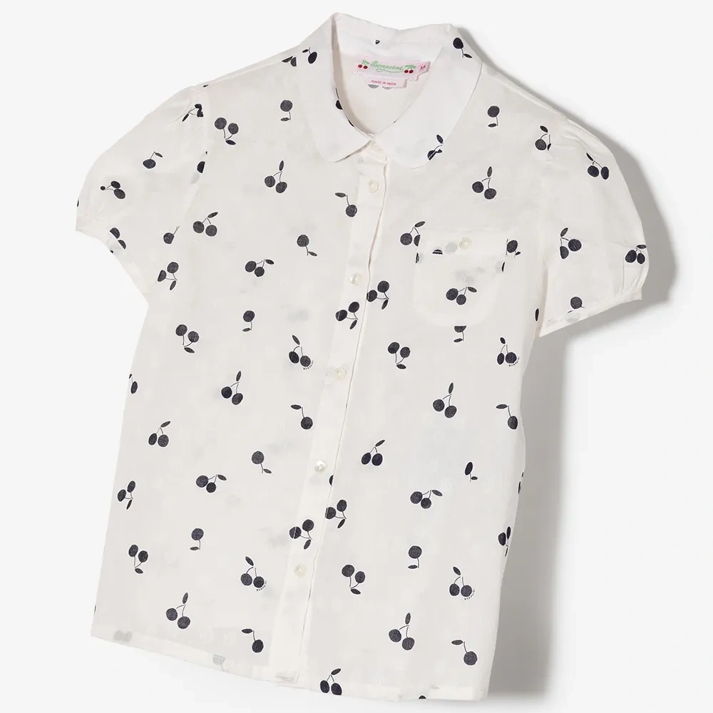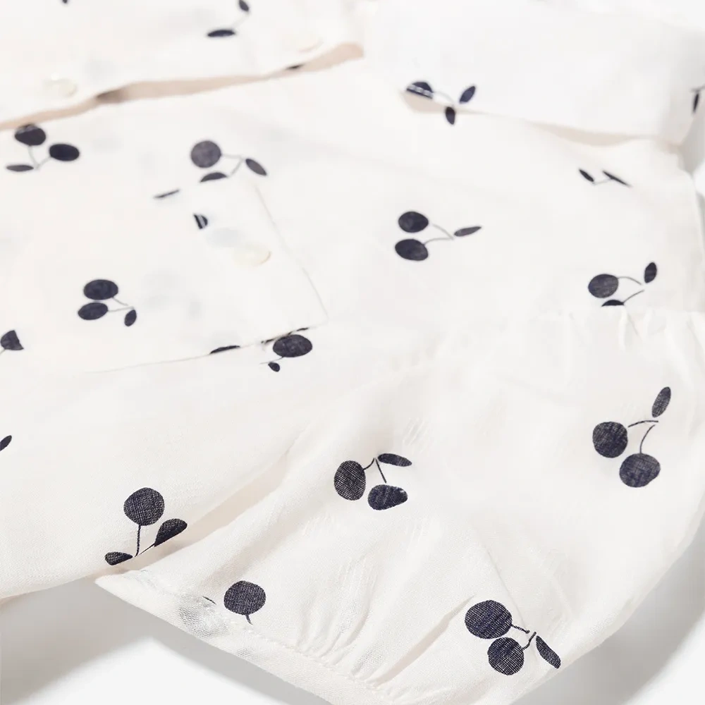 Кремовый, черный, хлопок, знаковый принт Cherry, классический воротник, застежка на пуговицах спереди и короткие рукава.