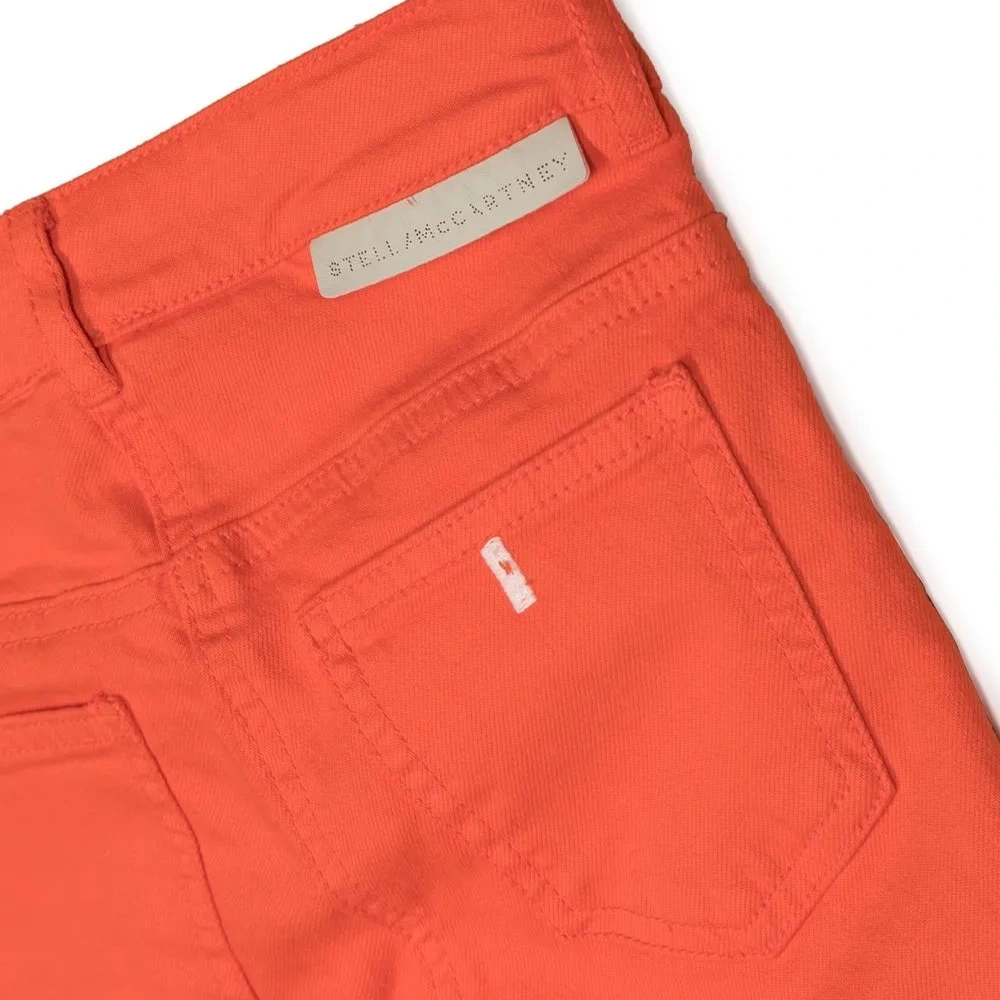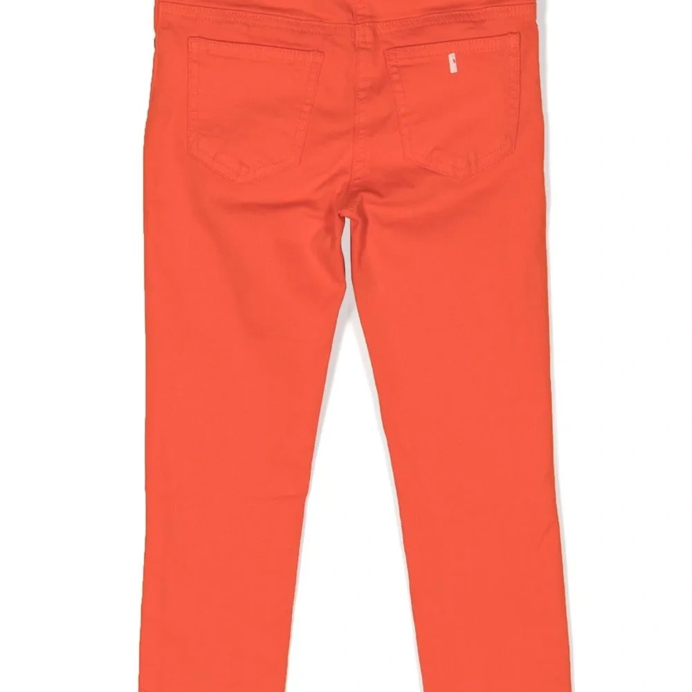 Оранжевый, эластичный хлопок, средняя посадка, петли для ремня, застежка на молнии и пуговице спереди, пять карманов и прямой крой.