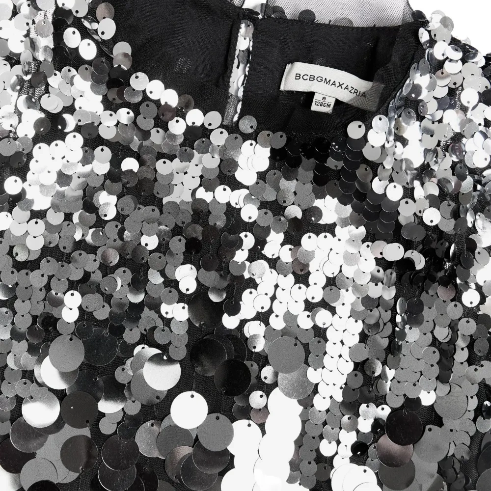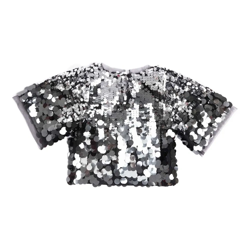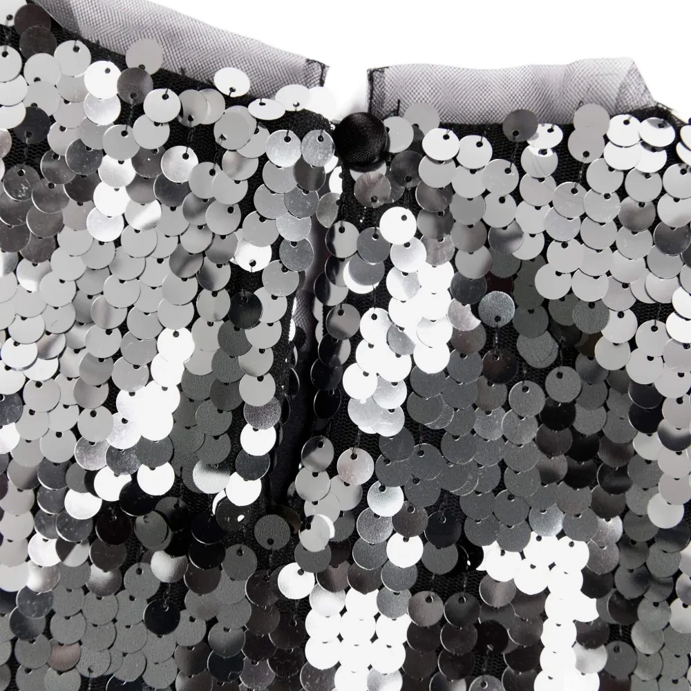 серебристый тон, дизайн с пайетками, круглый вырез, короткие рукава, застежка на пуговицы сзади