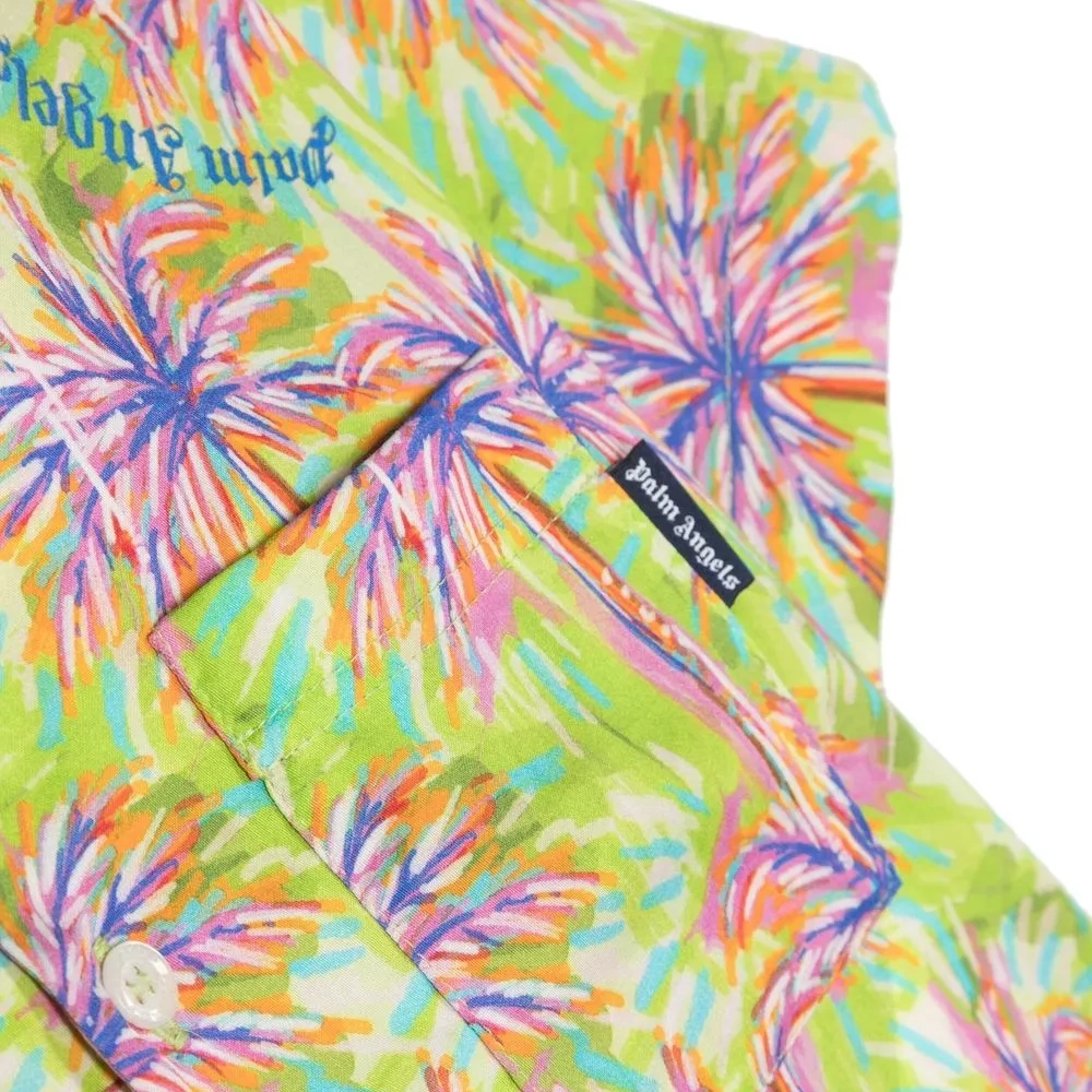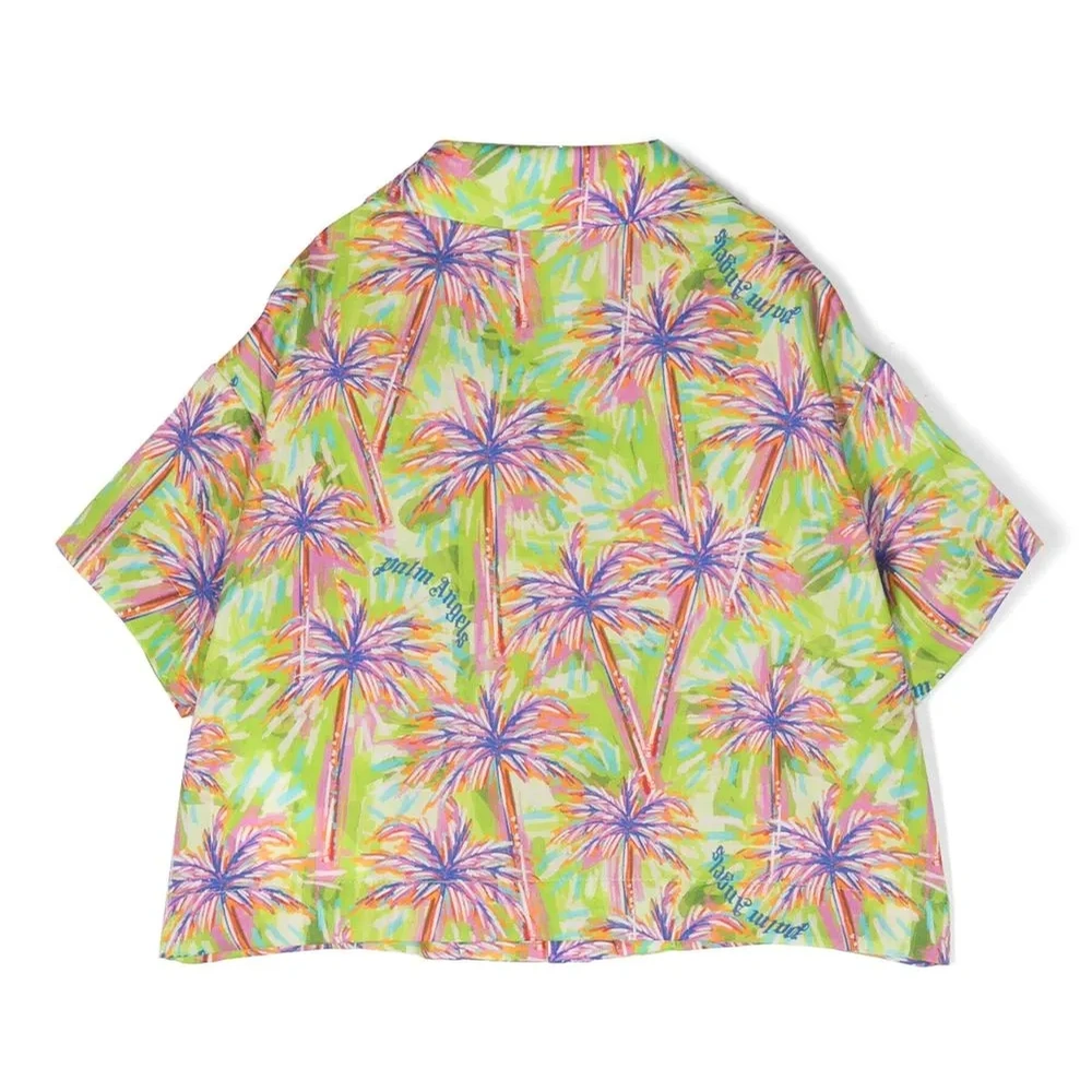 Разноцветный, хлопок, сплошной принт с логотипом, принт с изображением пальм, зазубренный воротник, застежка на пуговицах спереди, короткие рукава, прорезной карман на груди и прямой подол.