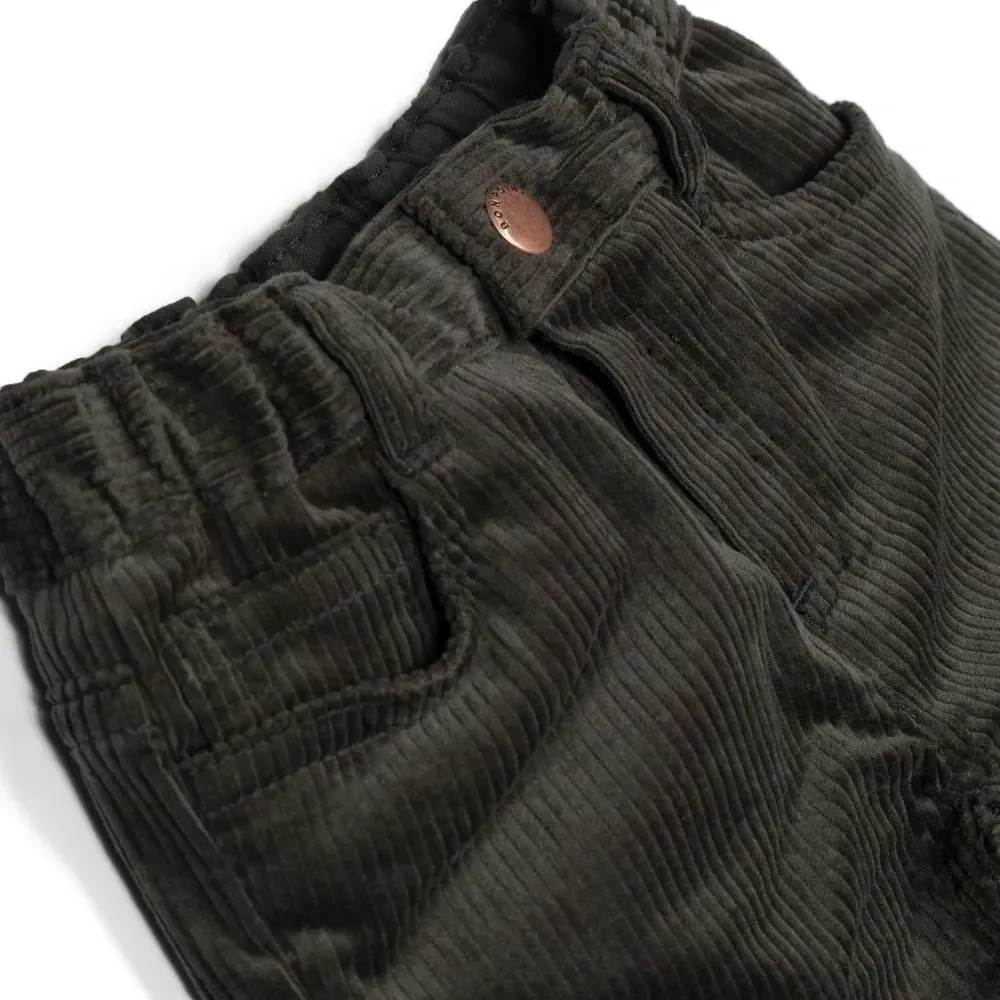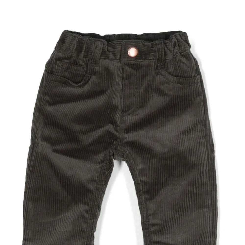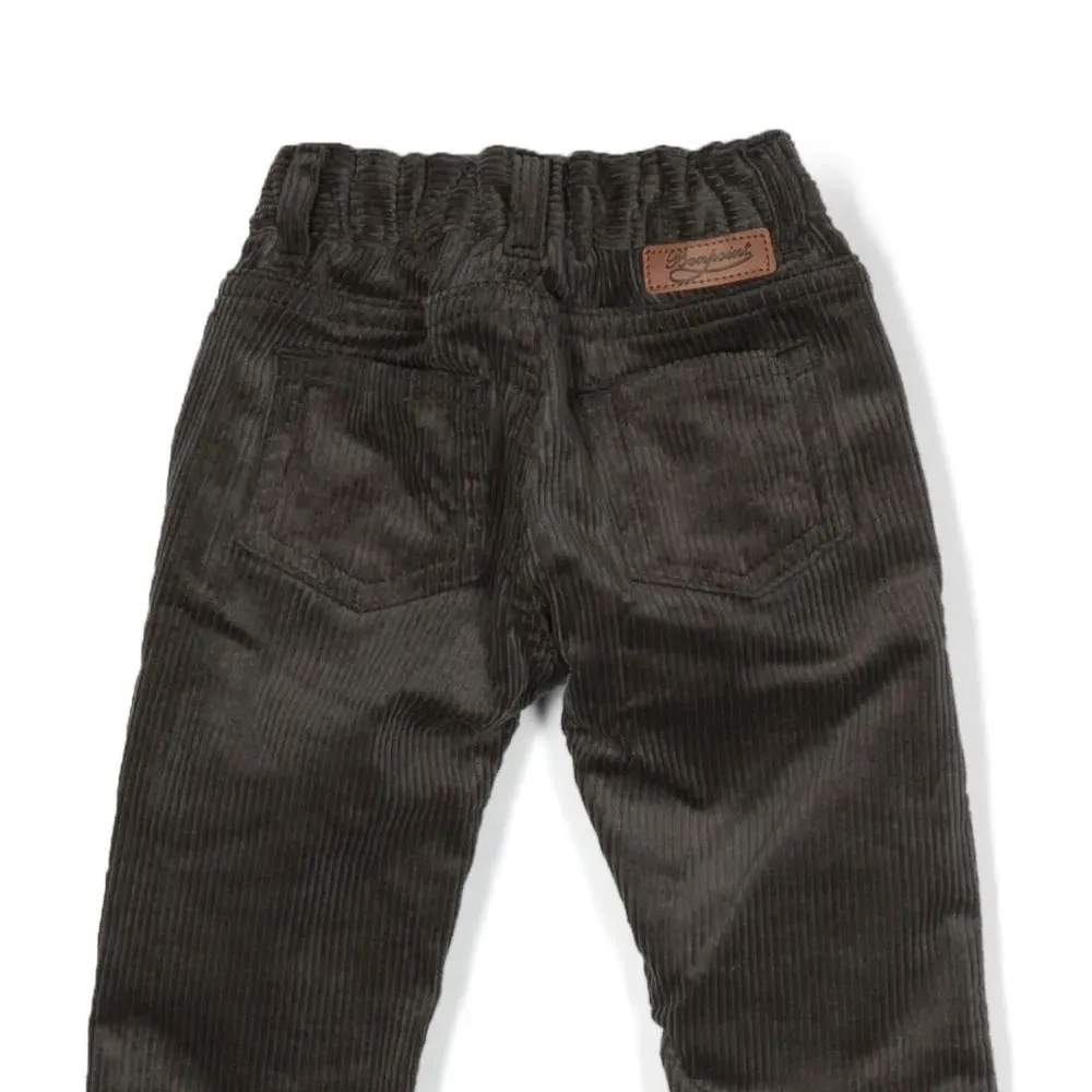 Шиферно-серый, эластичный хлопок, вельветовый материал, нашивка с логотипом сзади, застежка на кнопки и молнию спереди, петли для ремня, пять карманов и прямой крой.