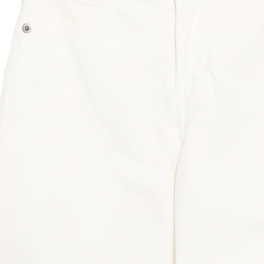 белые джинсы с необработанным краем, застёжкой на пуговицы, шлёвками для ремня и нашивкой с логотипом сзади