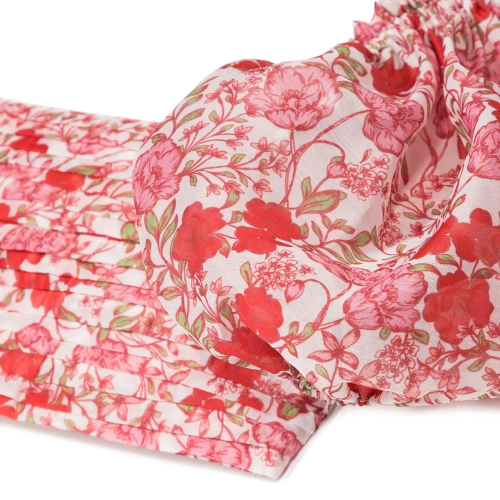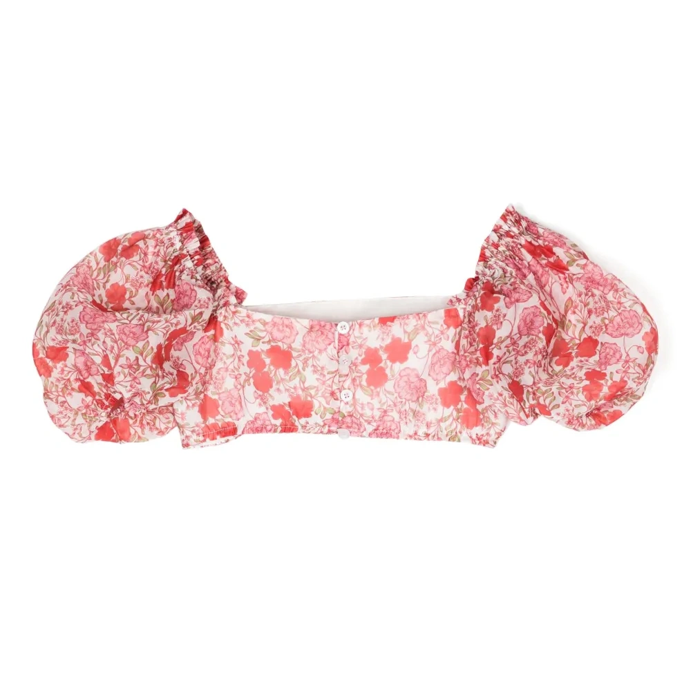 Малиновый, разноцветный, детали с оборками, короткие объемные рукава, квадратный вырез, застежка на пуговицы сзади и укороченная длина.