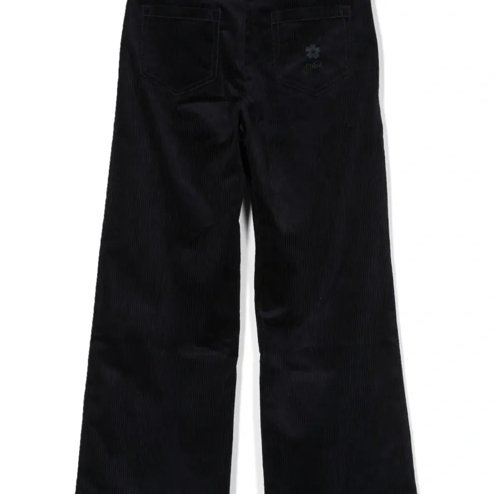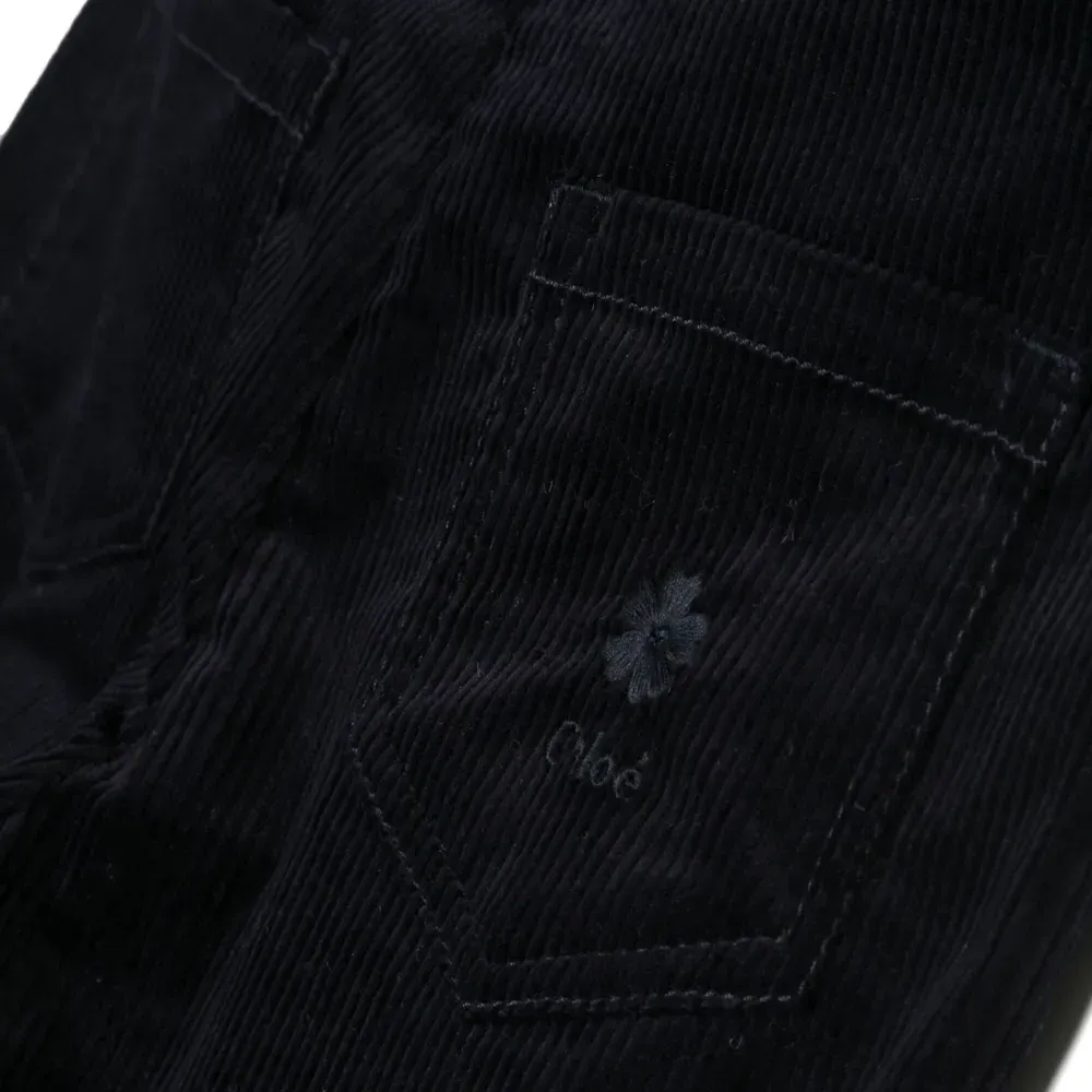 Темно-синий, эластичный хлопок, вельветовый материал, вышитый логотип сзади, петли для ремня, потайная застежка на молнии и пуговицах, пять карманов и широкий крой.