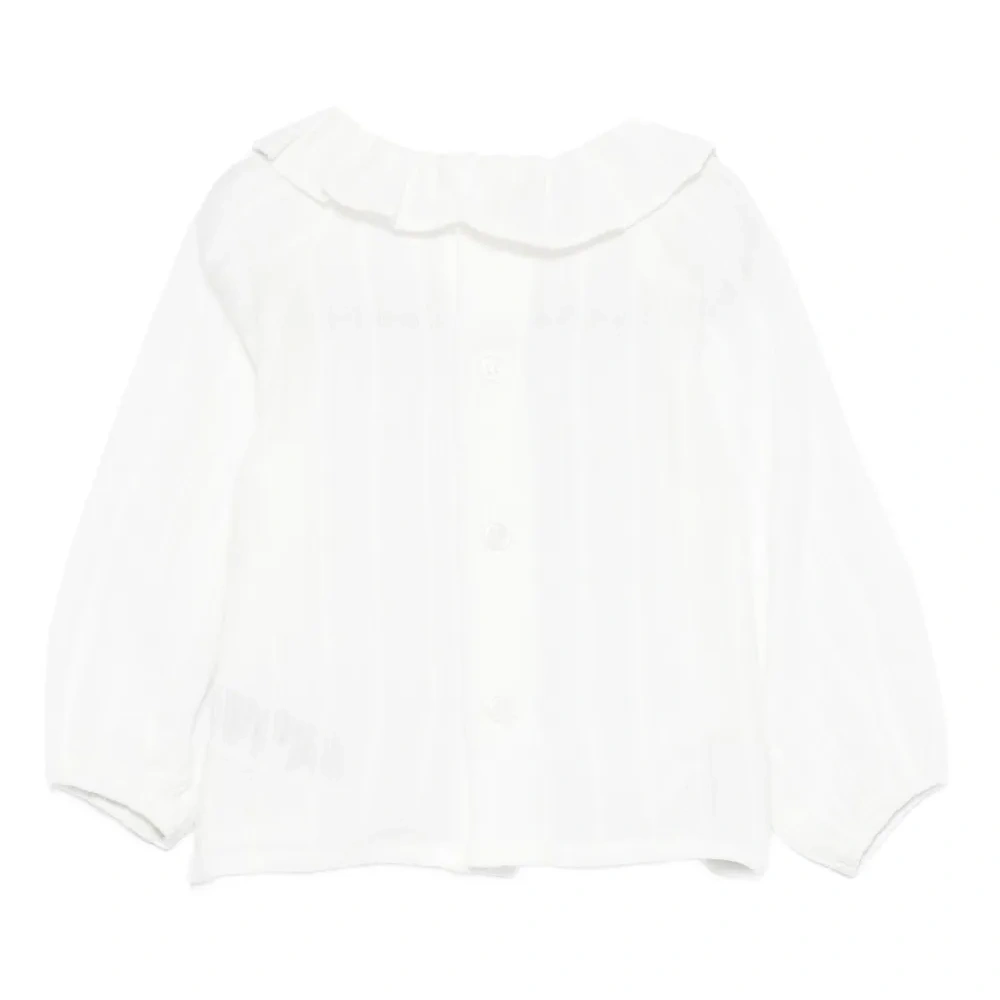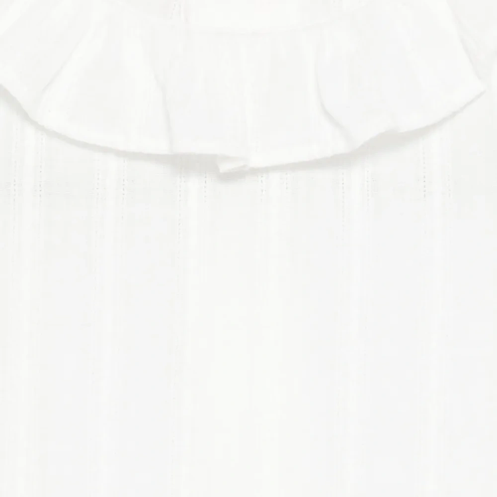 белый воротник с оборками, ребристая текстура, длинные рукава, застежка на пуговицы, пышные рукава