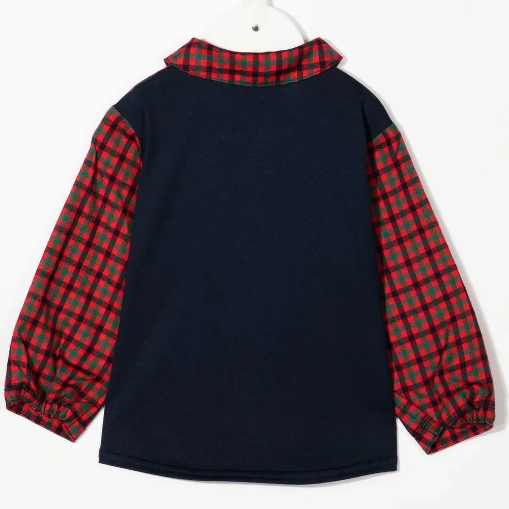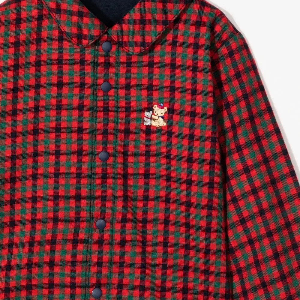 Красный, темно-синий, смесовый хлопок, вставки, клетка гингем, вышитый логотип на груди, классический воротник, застежка на пуговицах спереди, длинные рукава и прямой подол.