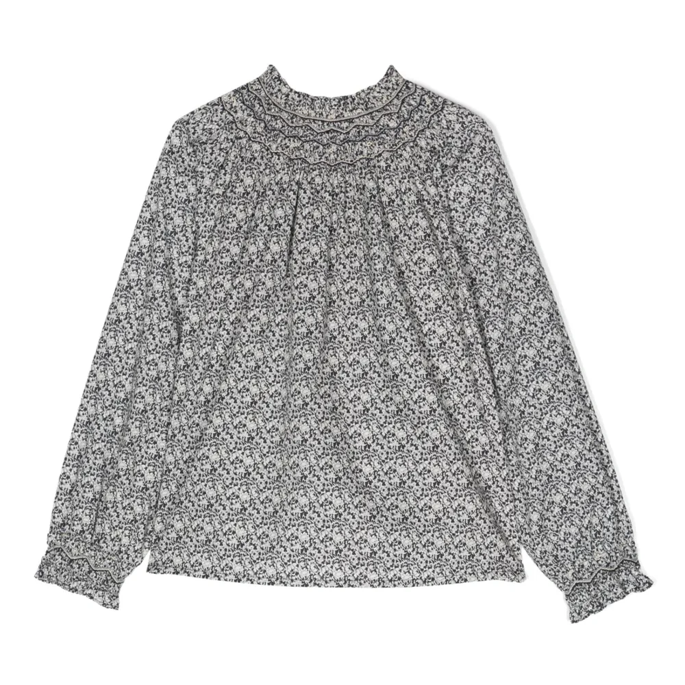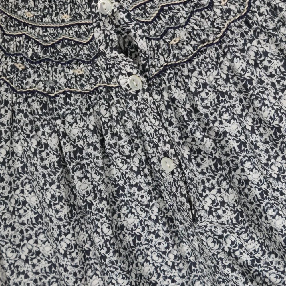 Темно-синий, белый, хлопок, сплошной цветочный принт, круглый вырез, застежка на пуговицах спереди, длинные рукава и прямой подол.