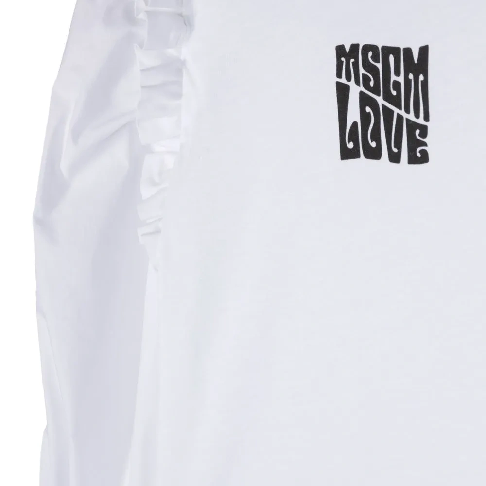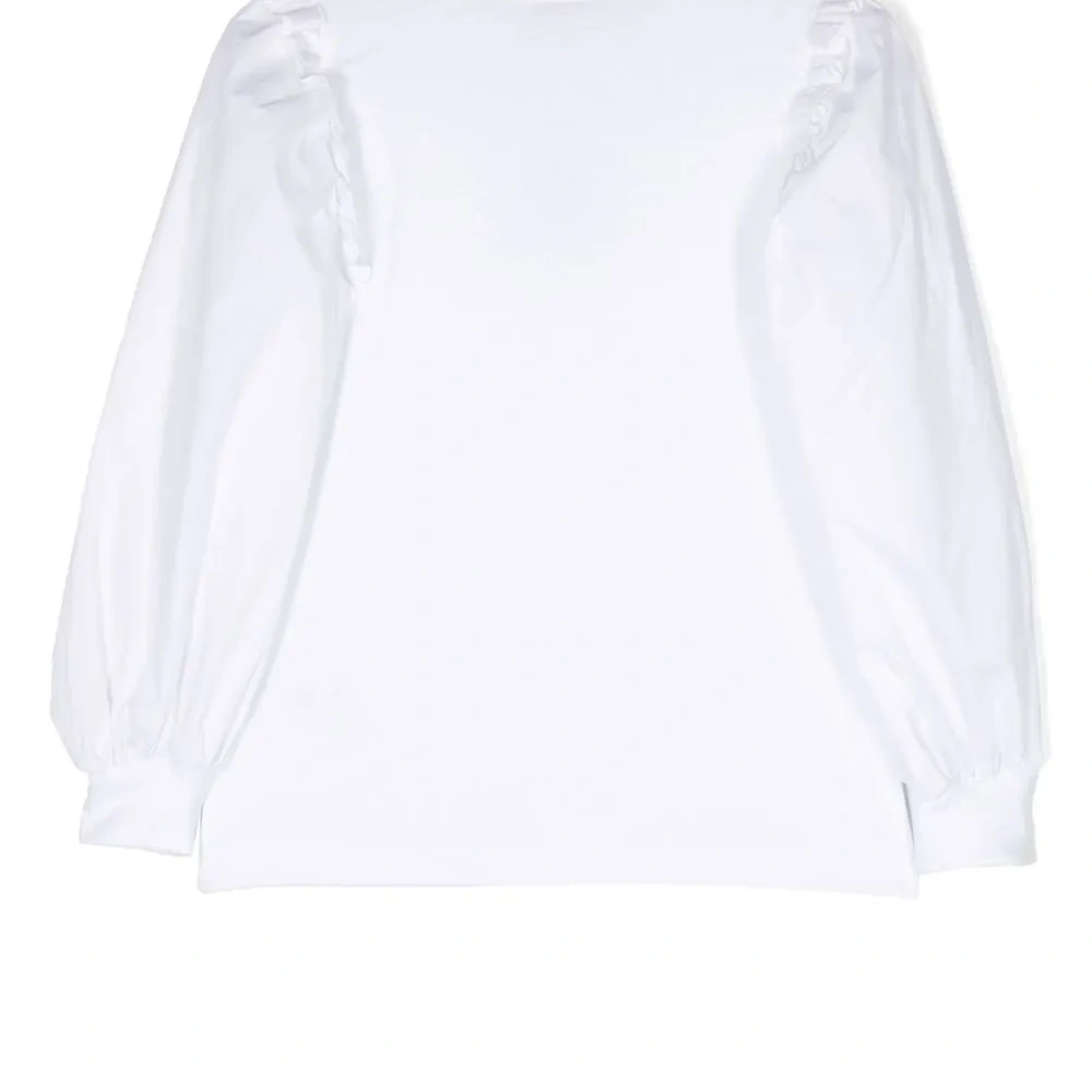Текстовый принт, вставки с оборками, круглый вырез, длинные рукава и прямой подол.