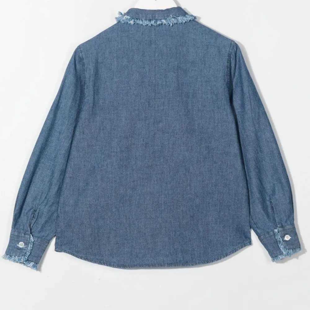 Голубой, хлопок, необработанные края, классический воротник, застежка на пуговицах спереди, длинные рукава, манжеты на пуговицах и закругленный подол.