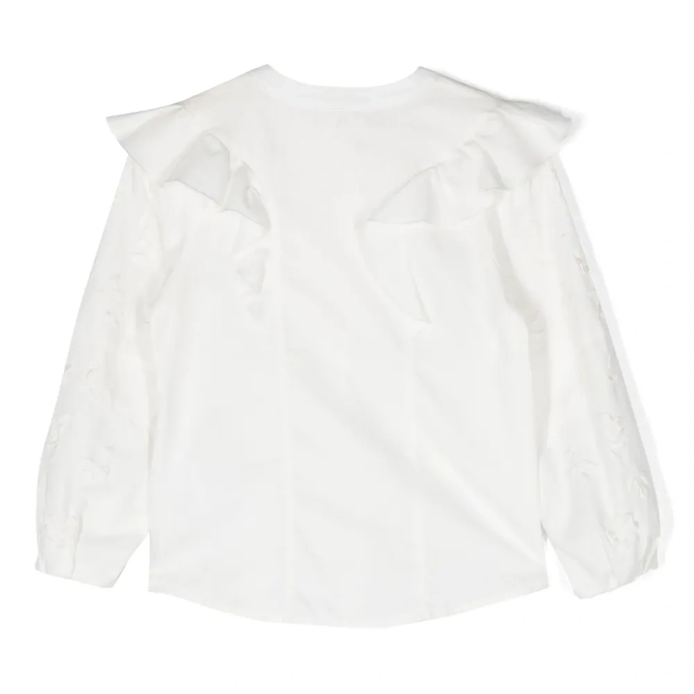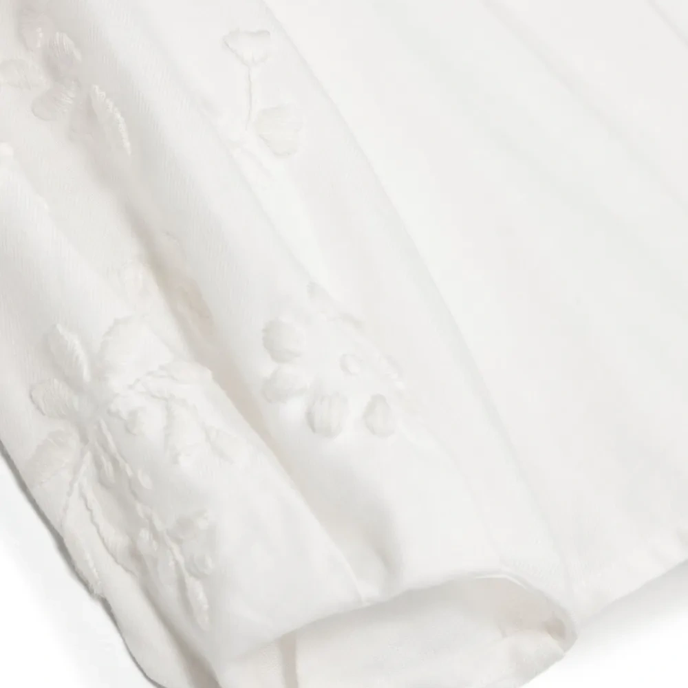 Молочно-белый, хлопок, вставки с оборками, вышивка, круглый вырез, застежка на пуговицах спереди, длинные рукава и прямой подол.