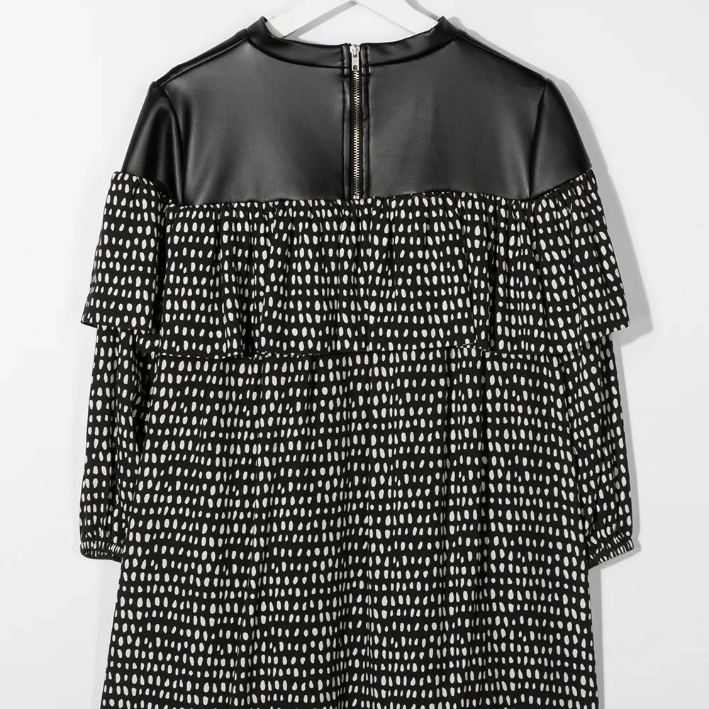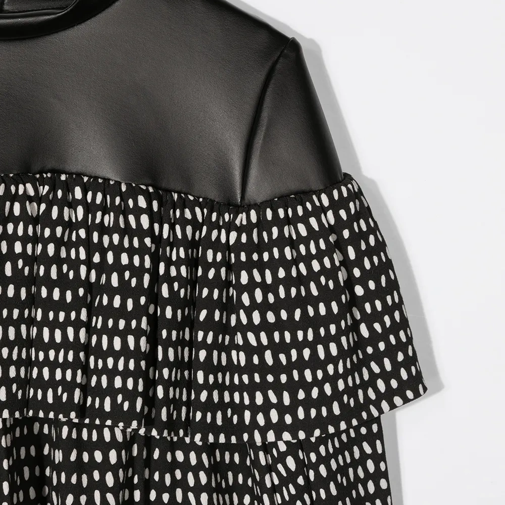 Контрастные вставки, вставки с оборками, круглый вырез, застежка на молнии сзади, длинные рукава и прямой подол.