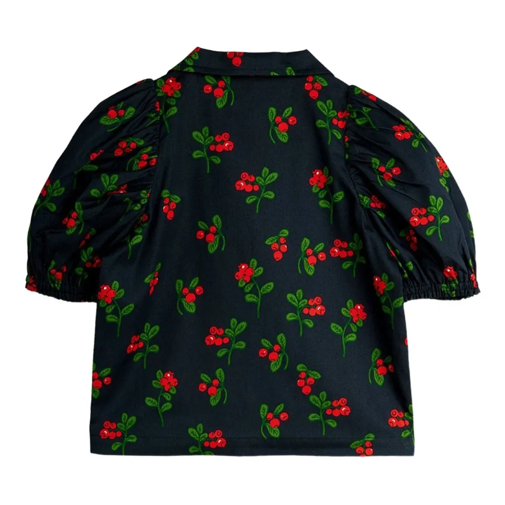 чёрная рубашка с цветочным принтом, застёжкой на пуговицах, короткими пышными рукавами и классическим воротником