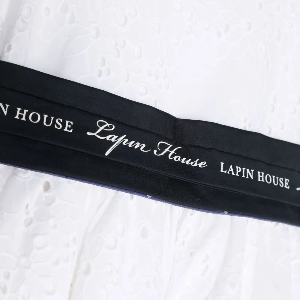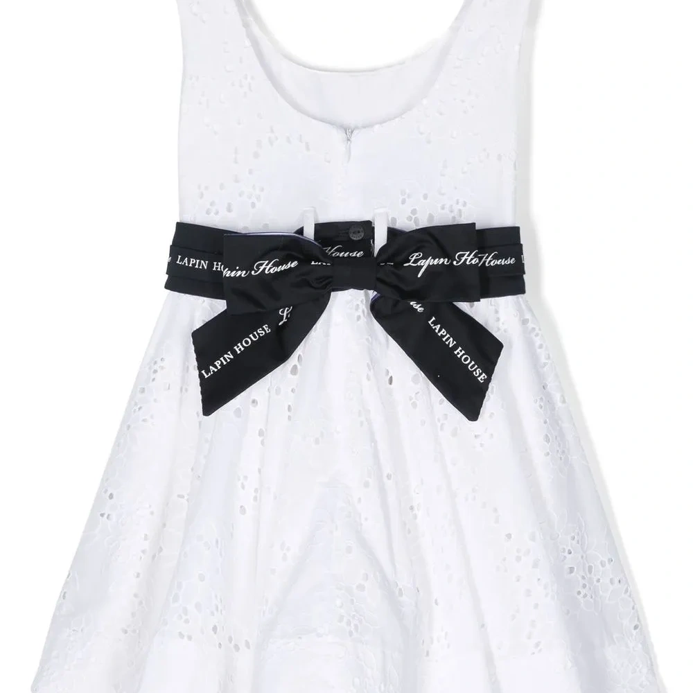 Белый, темно-синий, хлопок, английская вышивка, отделка лентой с логотипом, бант, U-образный вырез, потайная застежка на молнии сзади, расклешенная юбка, без рукавов и прямой подол.