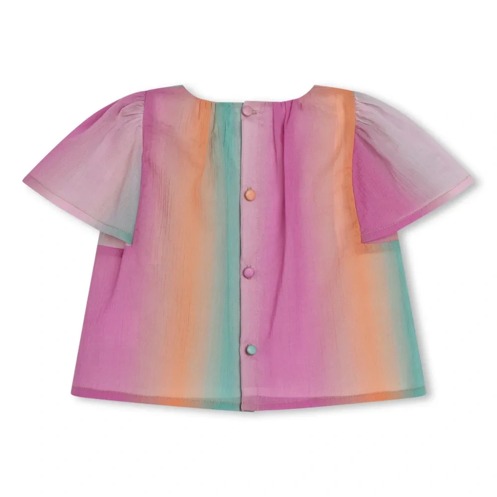 Розовый, хлопок, градиентный эффект, круглый вырез, складки, вышитый логотип спереди, застежка на кнопках сзади, короткие рукава и прямой подол.