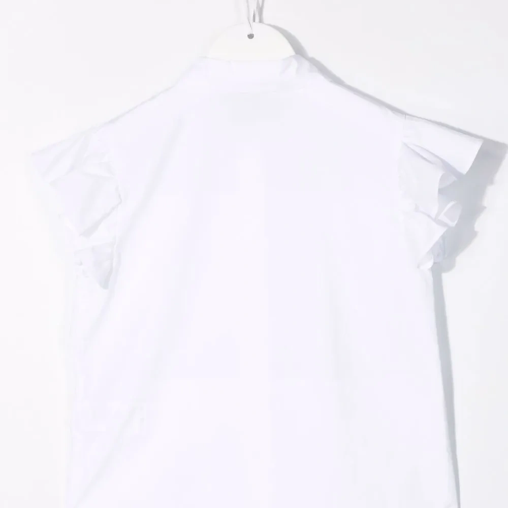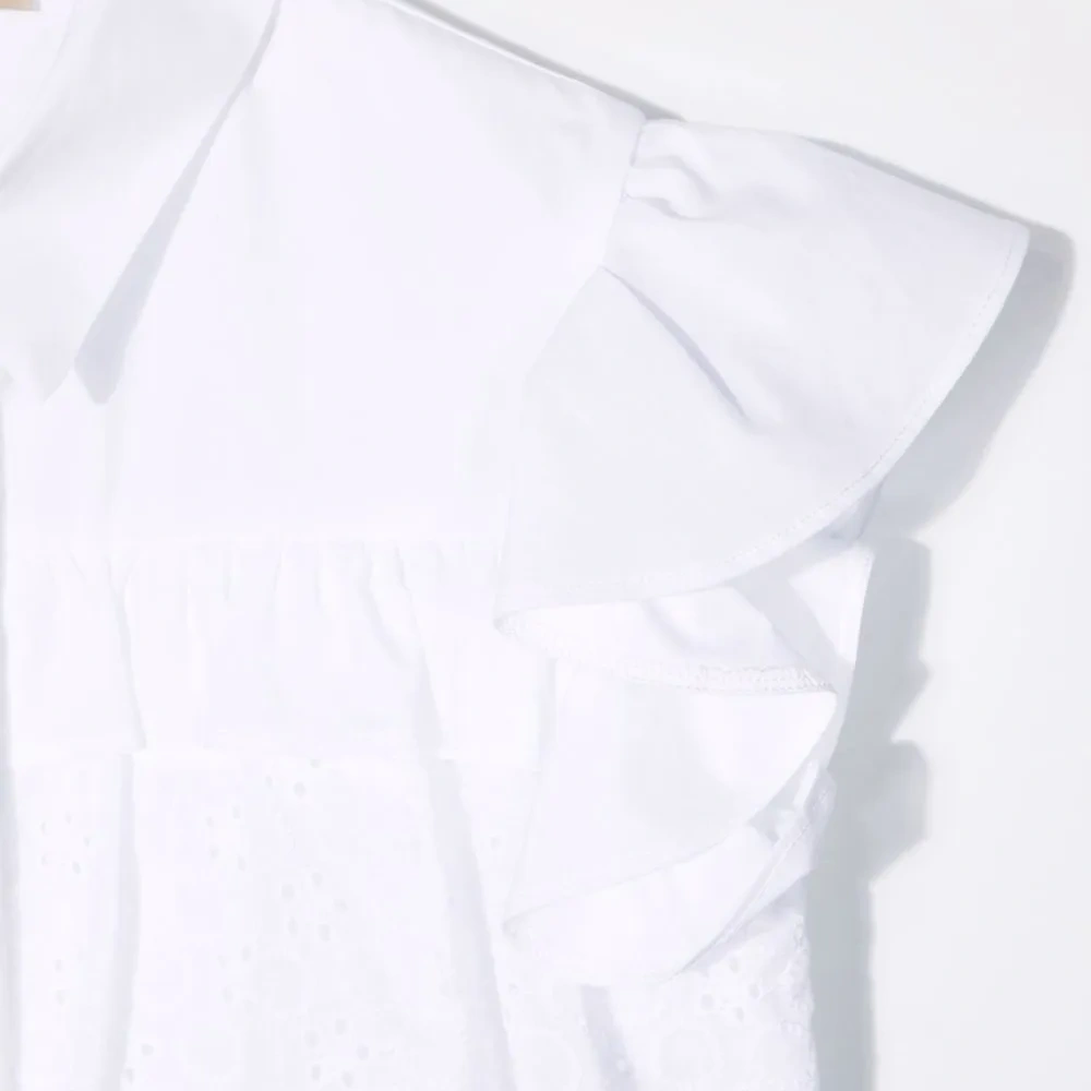 Вставки с оборками, дизайн со сборками, ажурная отделка, классический воротник, потайная застежка спереди, без рукавов, расклешенные манжеты и закругленный подол сзади. Цвет: белый.