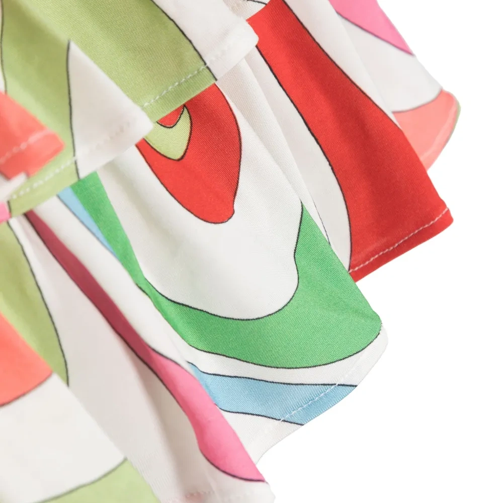 Белый/разноцветный, эластичный материал, сплошной графичный принт, ремешки на завязках, без рукавов и вставки с оборками.