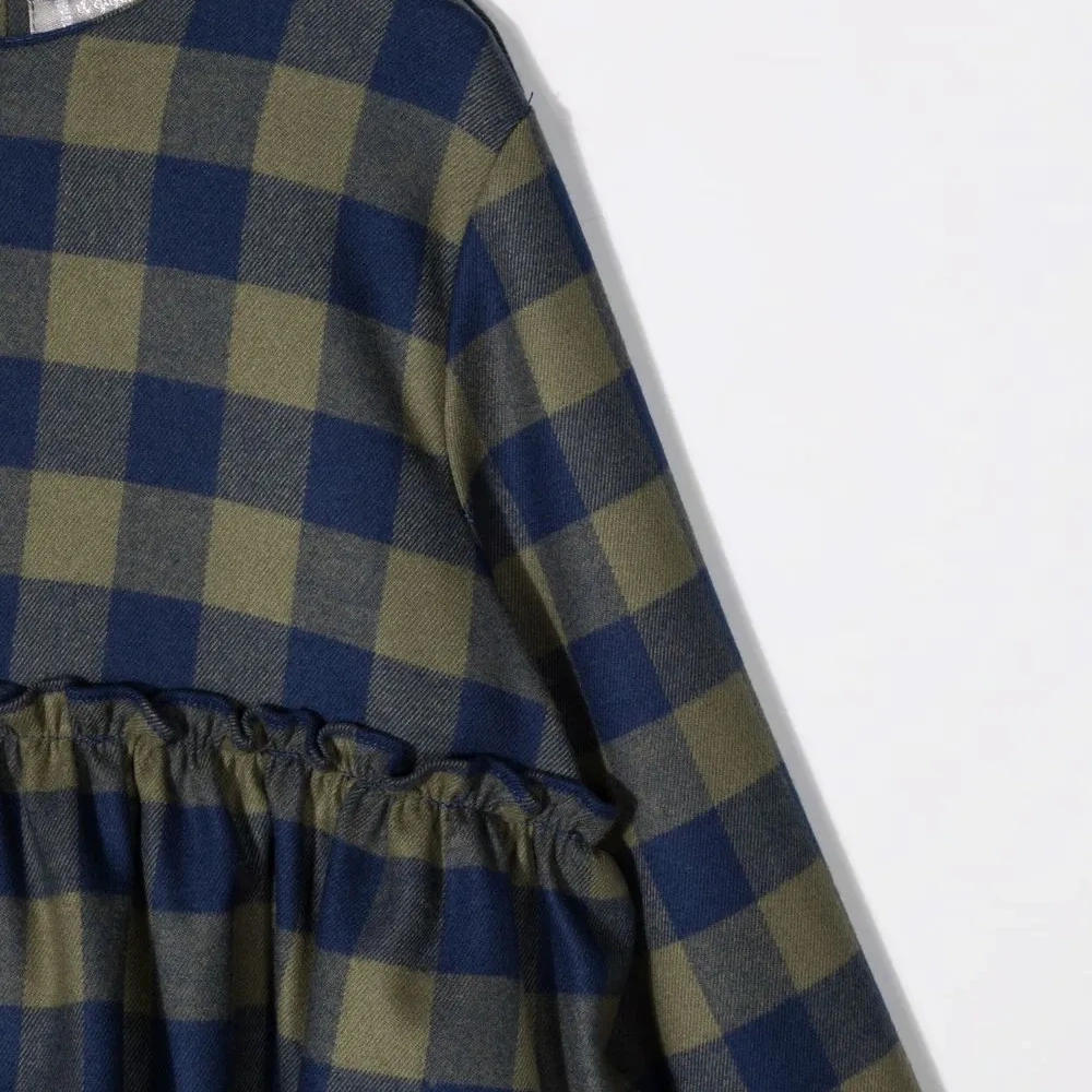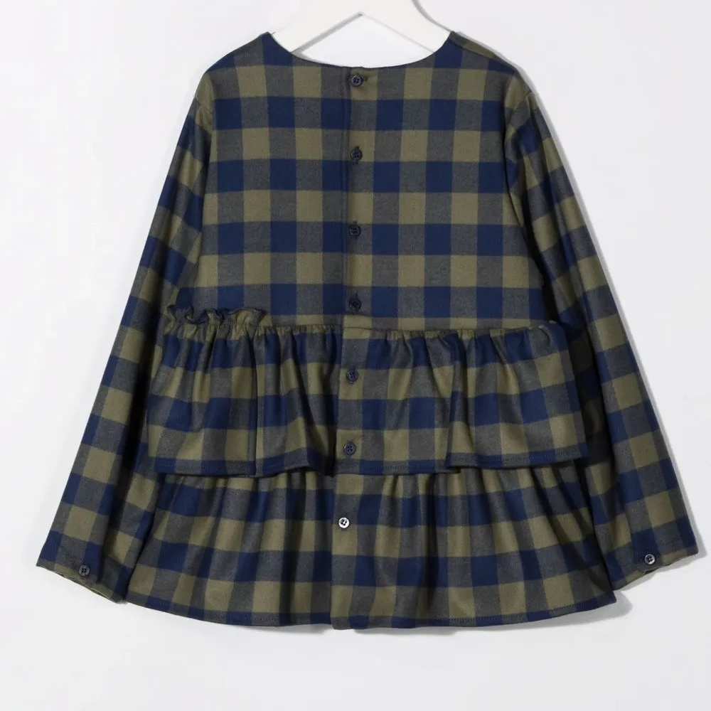 Клетка гингем, круглый вырез, застежка на пуговицы сзади, вставки с оборками, вставка со сборками и длинные рукава.