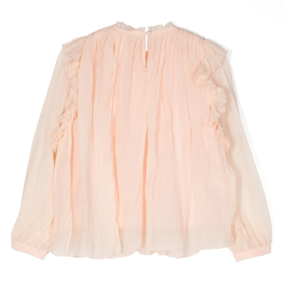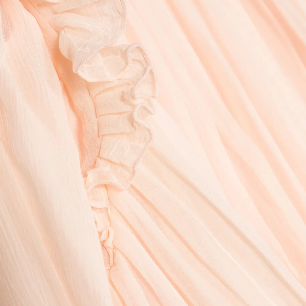 Персиково-розовый, шелк, складки, вставки с оборками, круглый вырез, застежка на пуговицы сзади, длинные рукава и прямой подол.