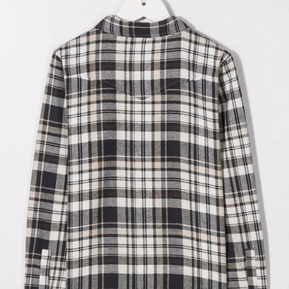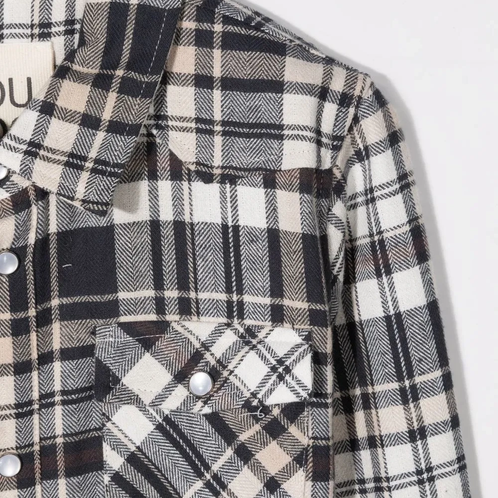 Принт в шотландскую клетку, косой воротник, застежка на заклепках, нагрудный карман на двух пуговицах, длинные рукава, манжеты на кнопках и прямой подол.