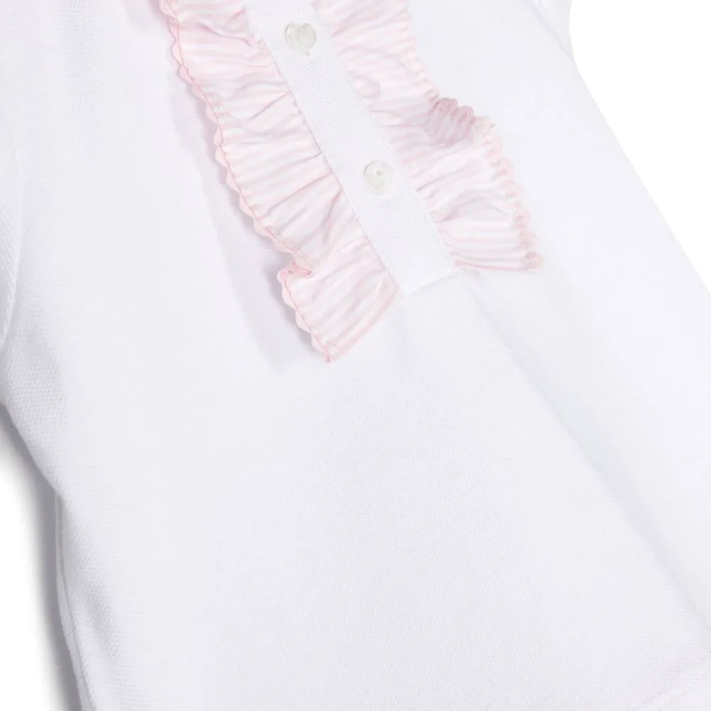 Белый, светло-розовый, узор в тонкую полоску, вставки с оборками, планка на пуговицах спереди, воротник поло, короткие рукава и плиссированная юбка.