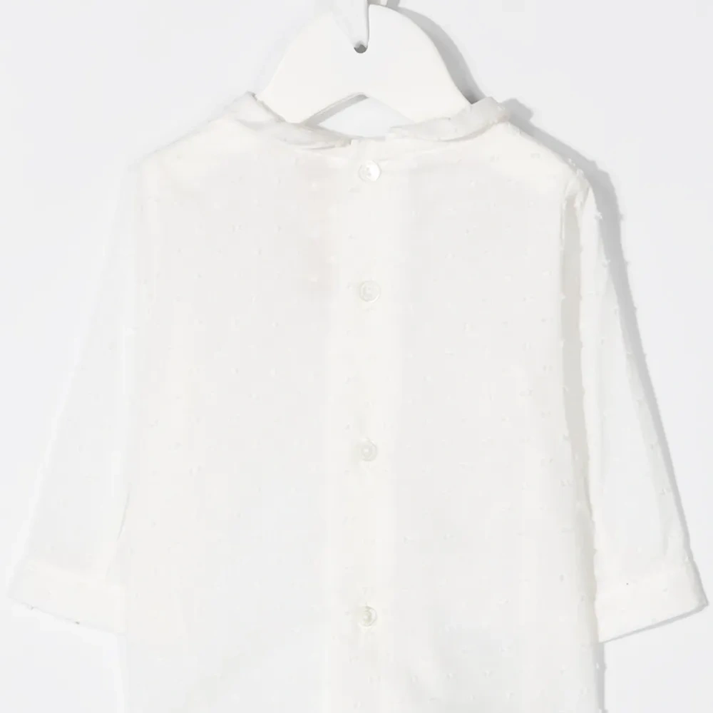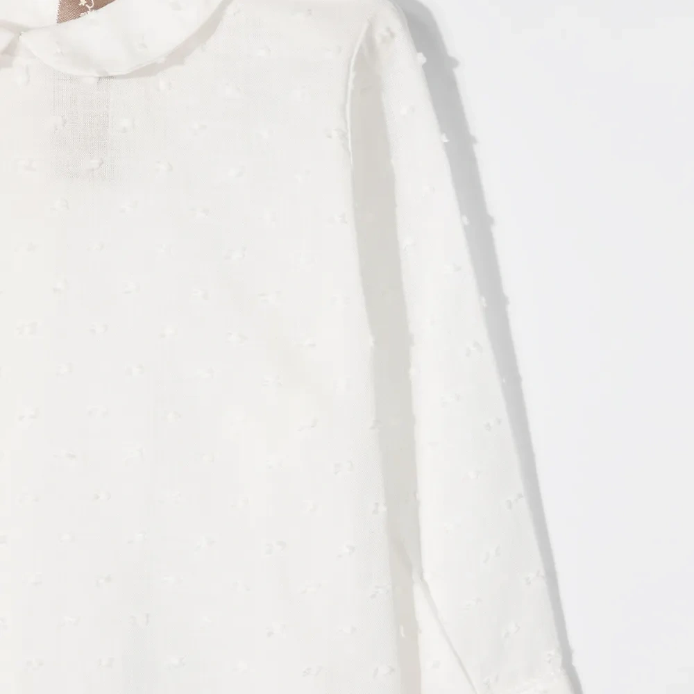 Вышивка с узором в горох, манишка, длинные рукава и круглый вырез. Цвет: белый.