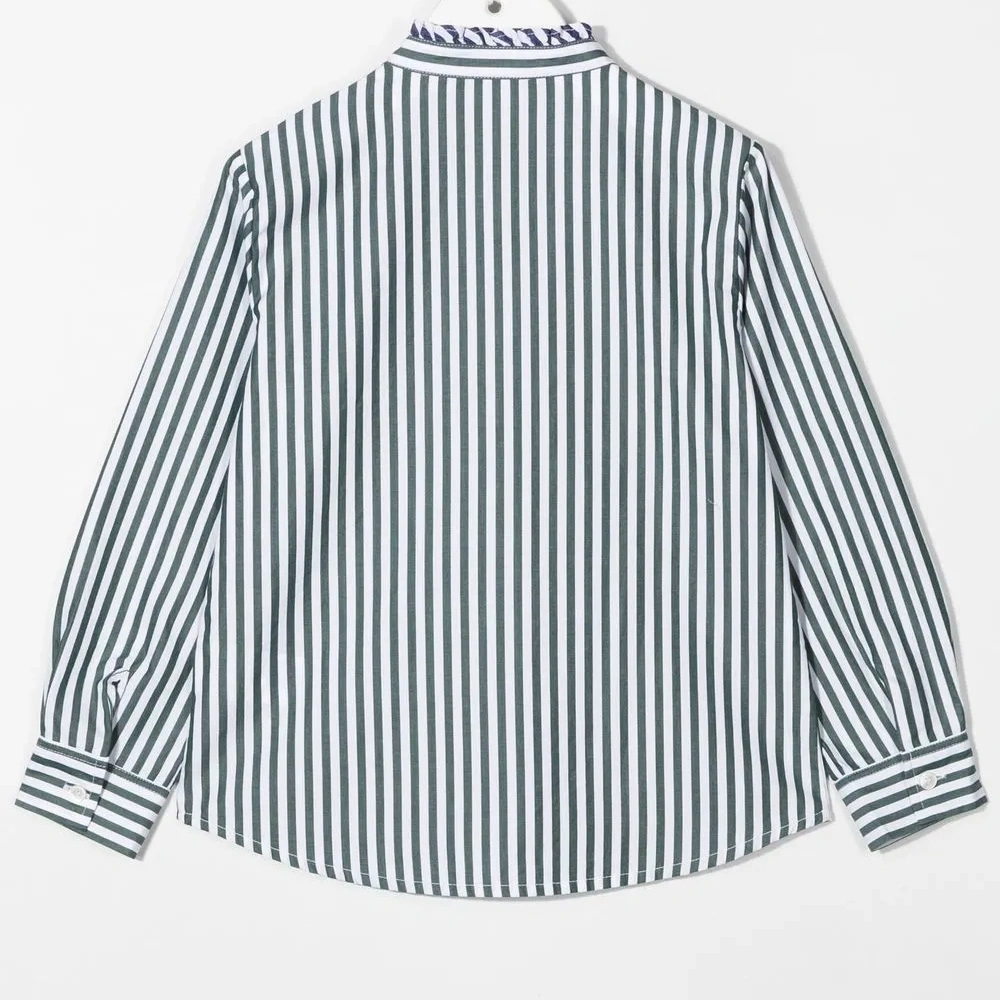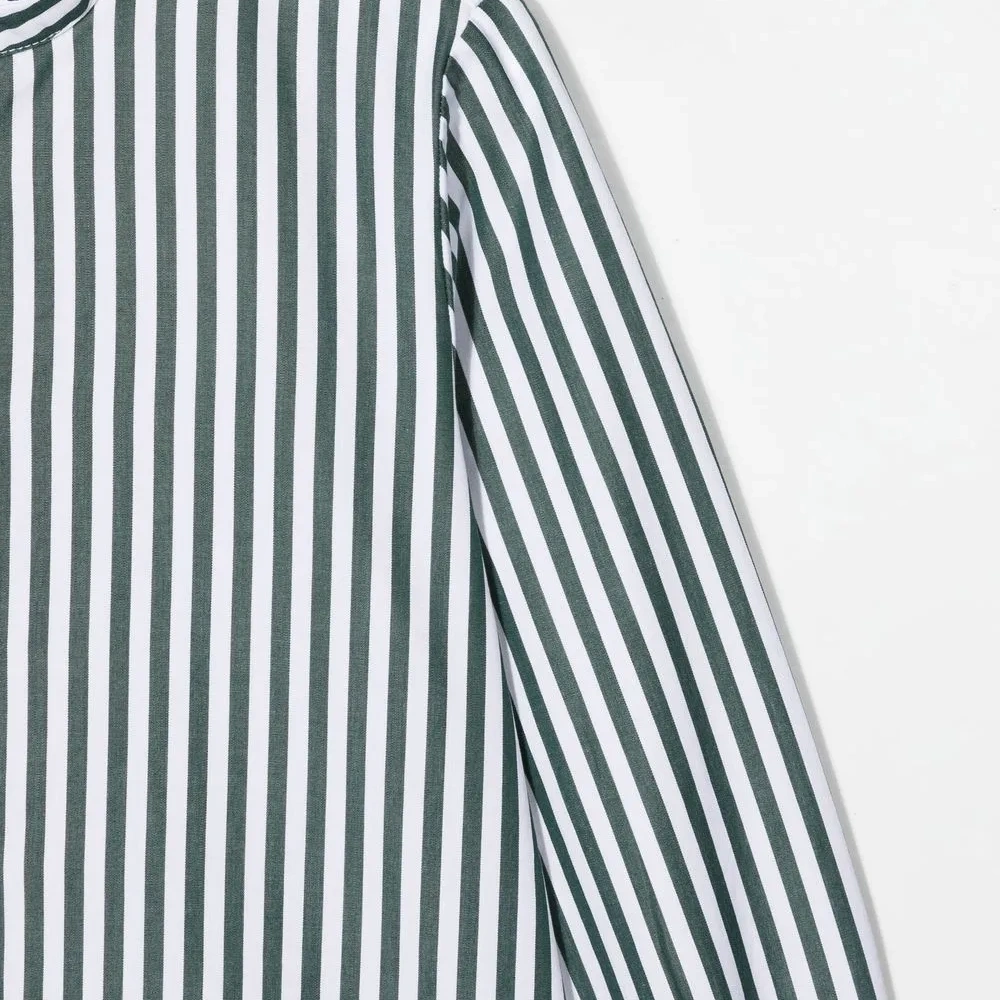 Темно-зеленый, кремовый, хлопок, принт в вертикальную полоску, воротник с оборками, застежка на пуговицах спереди, длинные рукава, манжеты на пуговицах и закругленный подол.