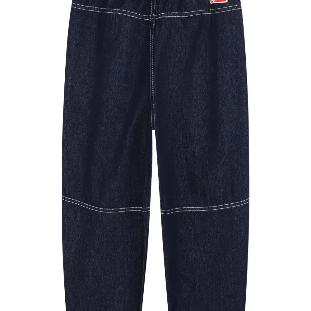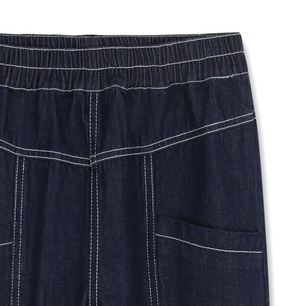 темно-синий цвет, контрастная строчка, эластичный пояс, накладные карманы, нашивка с логотипом