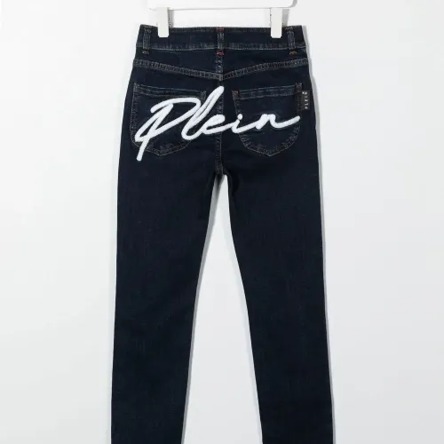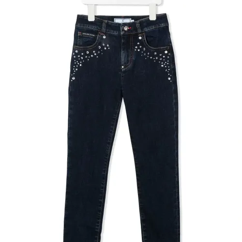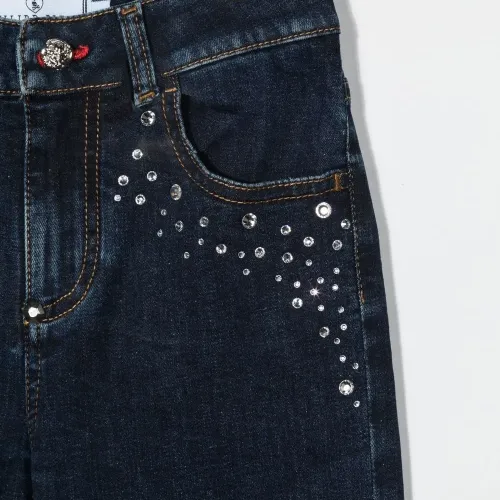 Темный оттенок денима, вышитый логотип, украшения из горного хрусталя, средняя посадка, узкий крой, застежка на молнии и пуговице спереди и пять карманов.