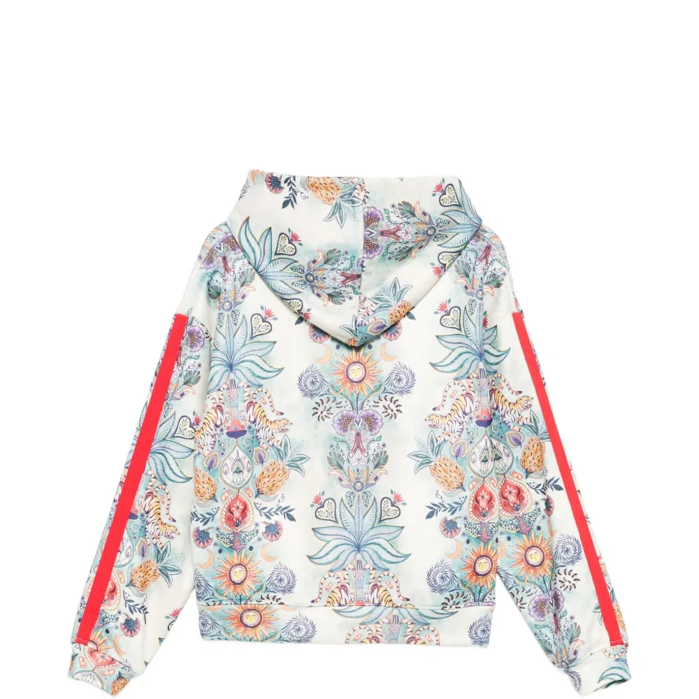 бежево-зеленый с цветочным принтом, с красными полосами, с длинными рукавами, с капюшоном
