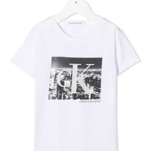 Футболка с фотопринтом от Calvin Klein Kids. Логотип спереди, круглый вырез и короткие рукава. Цвет: белый.