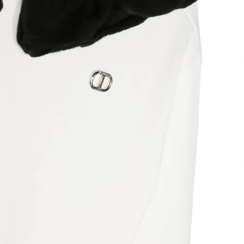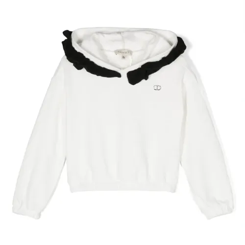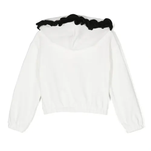 Белый, смесовый хлопок, контрастная отделка, отделка с оборками, серебристый металлический логотип, классический капюшон, приспущенные плечи, длинные рукава, эластичные манжеты и эластичный подол.
