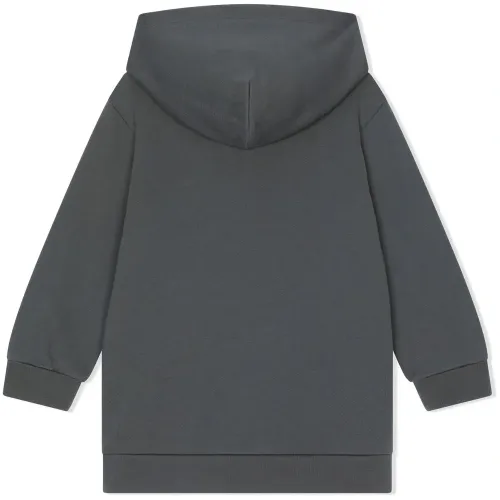 Темно-серый, металлический логотип, классический капюшон, длинные рукава, подол в рубчик и модель анорак.