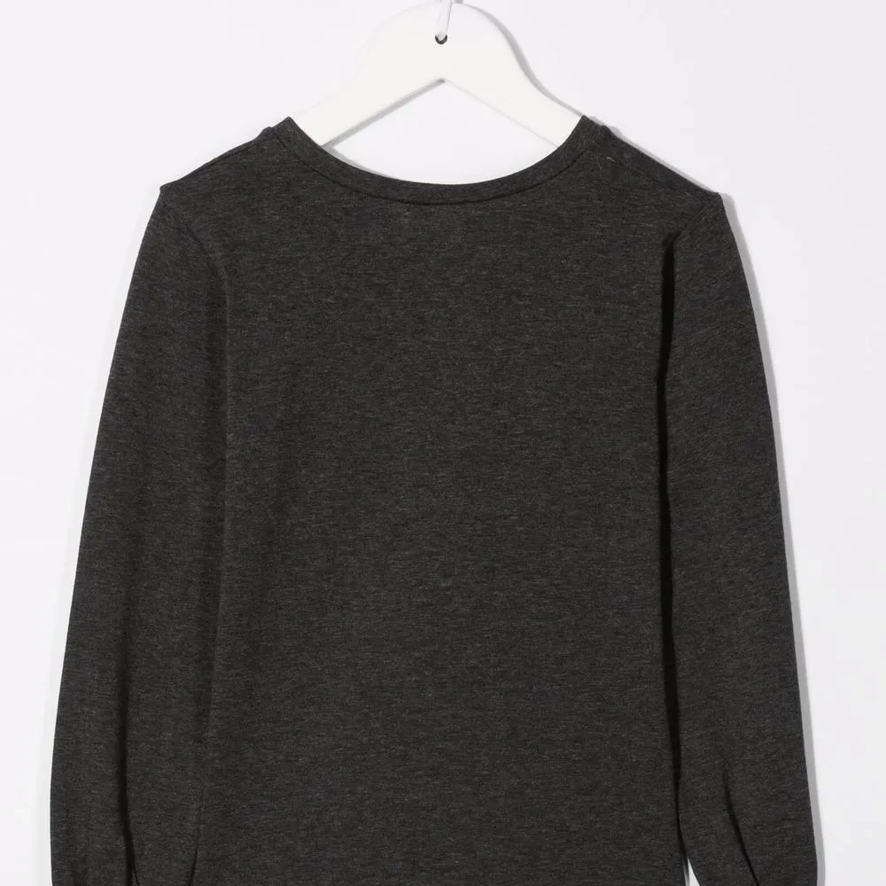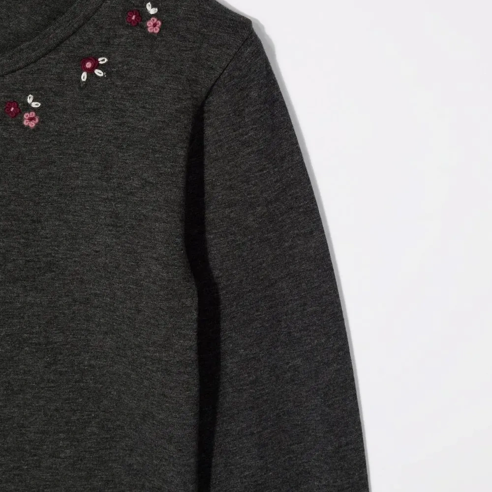 Цветочная вышивка, круглый вырез, длинные рукава, эластичные манжеты и прямой подол.