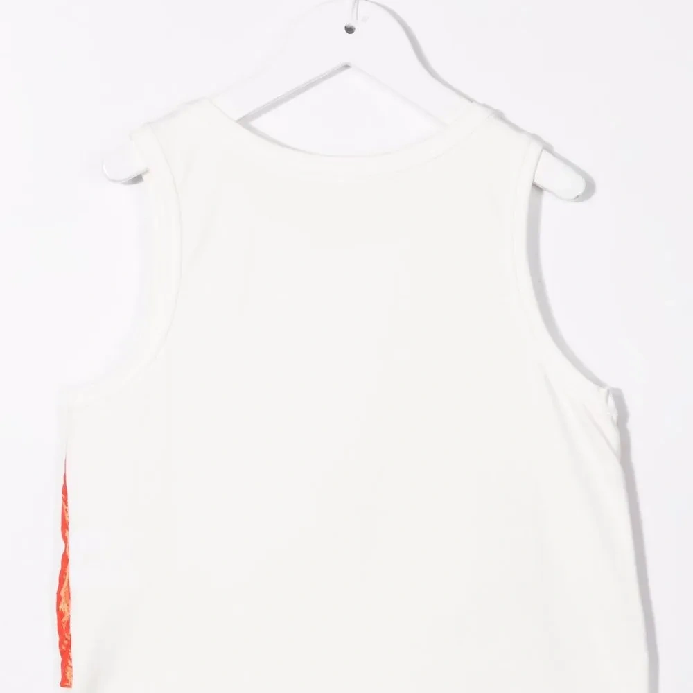 Перекрученная деталь, без рукавов, круглый вырез и прямой подол. .