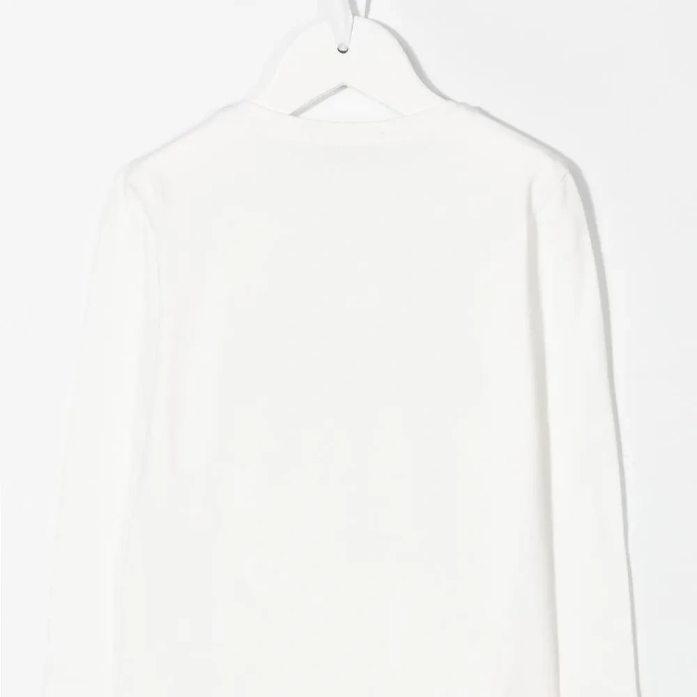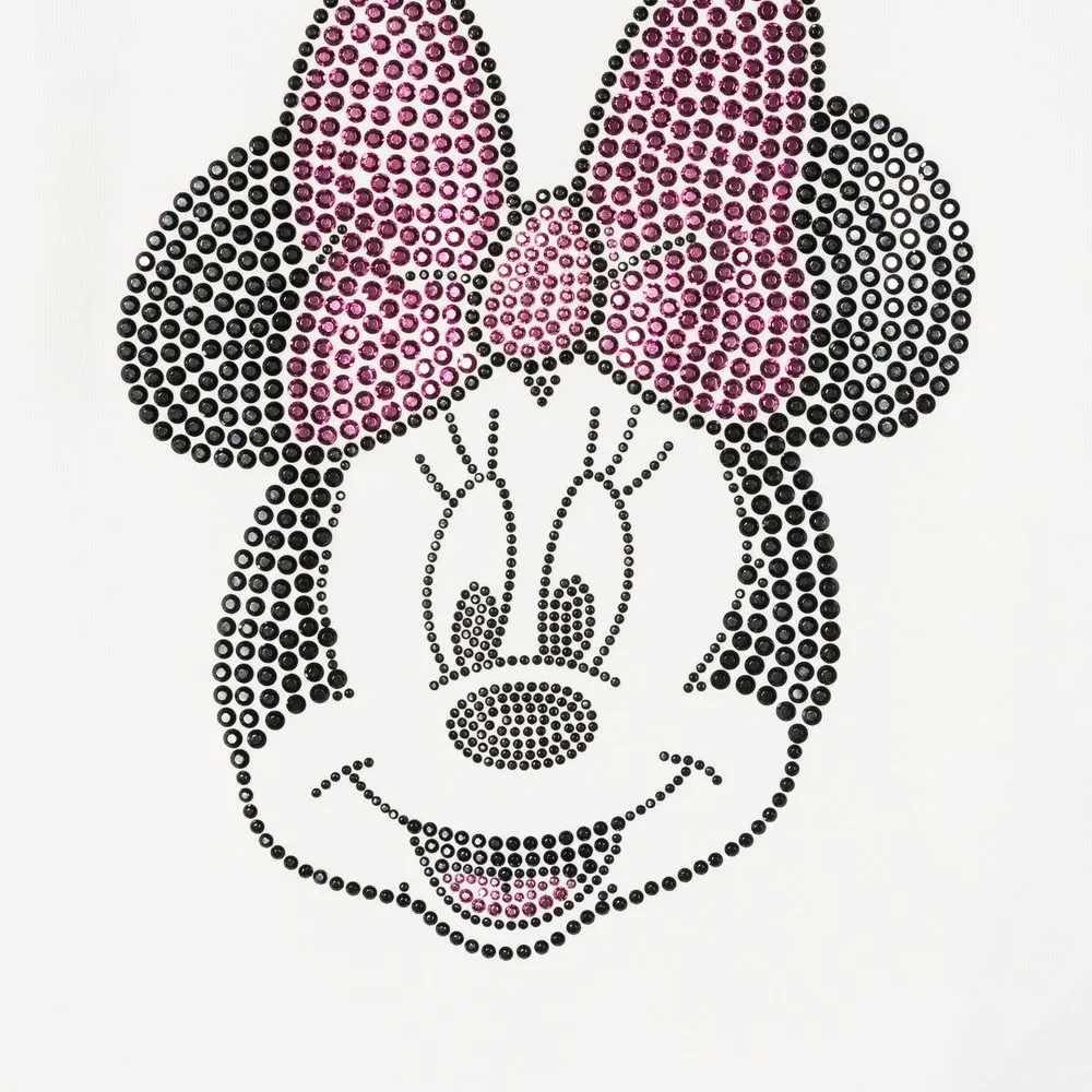 Белый, эластичный хлопок, мультипликационный принт, украшения из горного хрусталя, круглый вырез, длинные рукава и прямой подол.