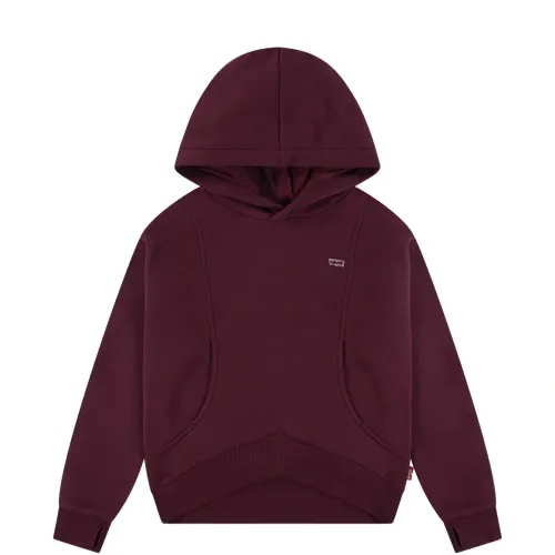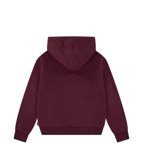 бордовый худи с нашивкой-логотипом, манжетами с отверстиями для больших пальцев, карманом-кенгуру, ребристым подолом и капюшоном