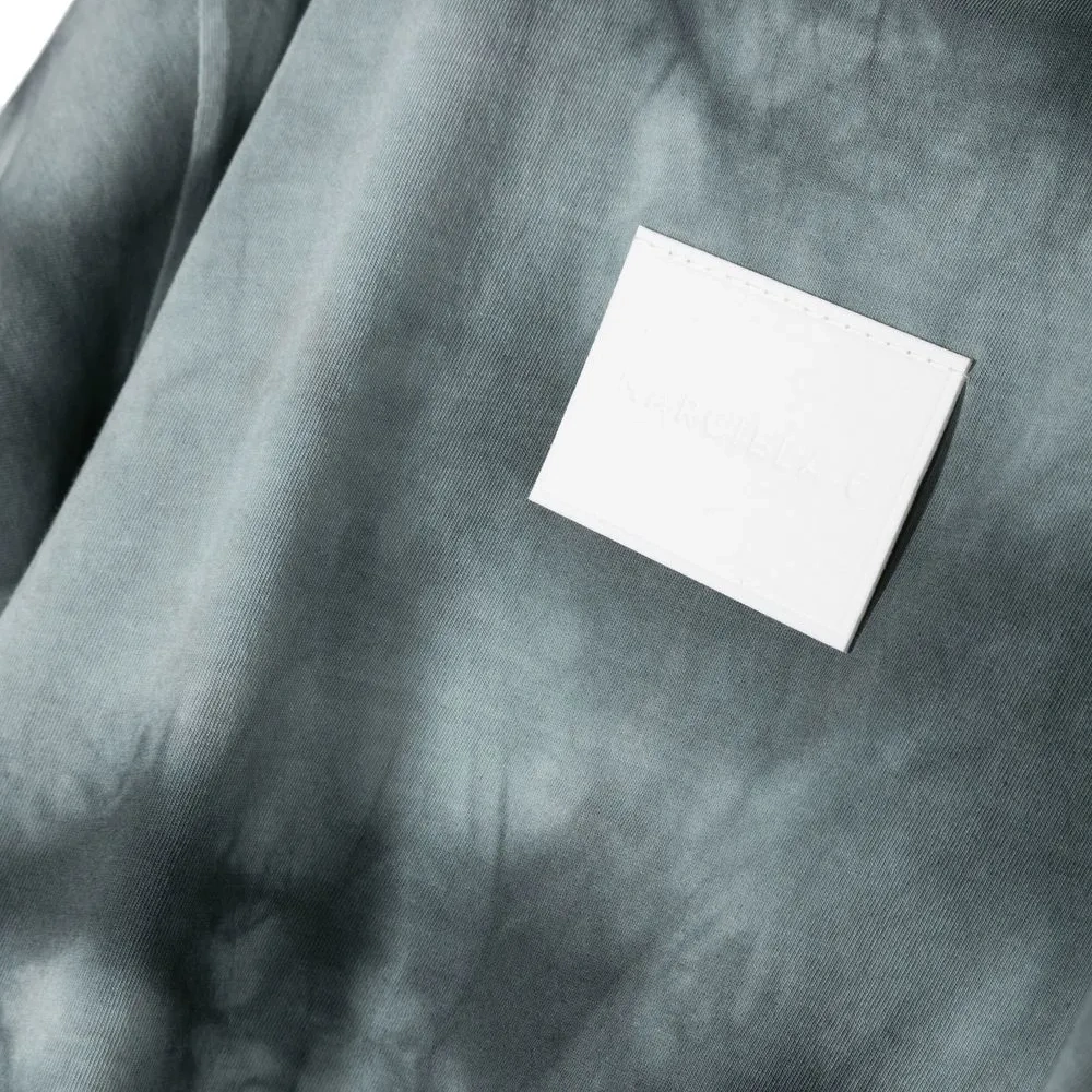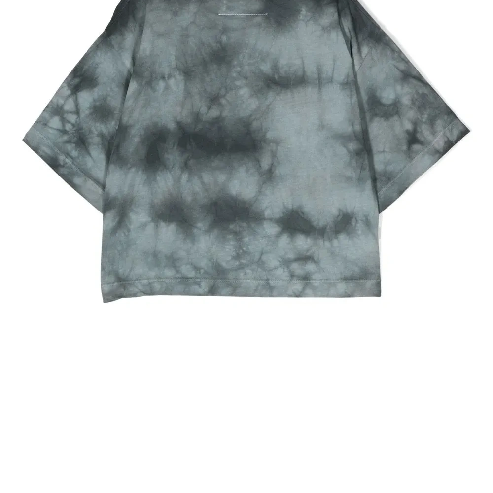 Серый, хлопок, ткань джерси, принт тай-дай, нашивка с логотипом на груди, круглый вырез, приспущенные плечи, короткие рукава, прямой подол и укороченная длина.