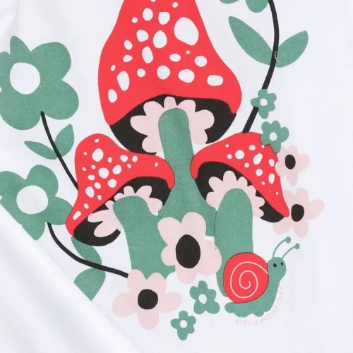 Белый, красный, хлопок, принт с изображением грибов, круглый вырез, короткие рукава и прямой подол.