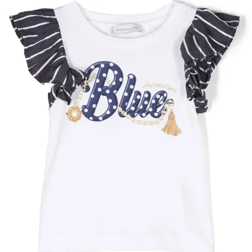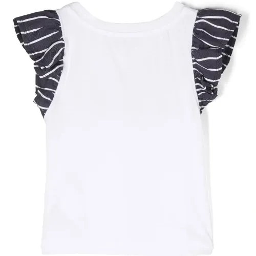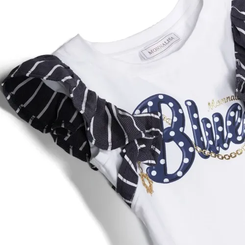 Белый, темно-синий, эластичный материал, принт с логотипом на груди, текстовый принт, круглый вырез и короткие рукава.
