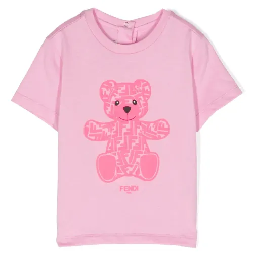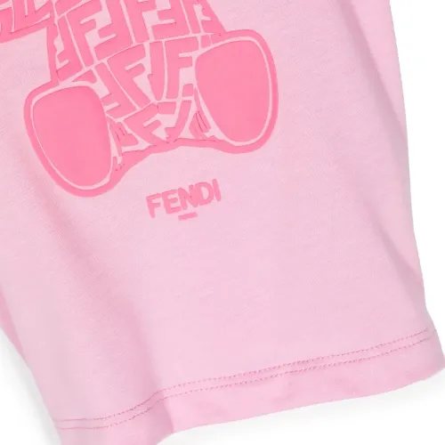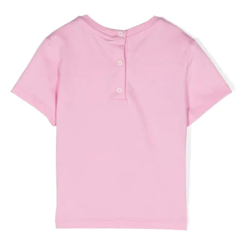 Нежно-розовый, хлопок, принт с изображением плюшевого медведя, логотип спереди, бархатное покрытие, круглый вырез, застежка на кнопках сзади, короткие рукава и прямой подол.